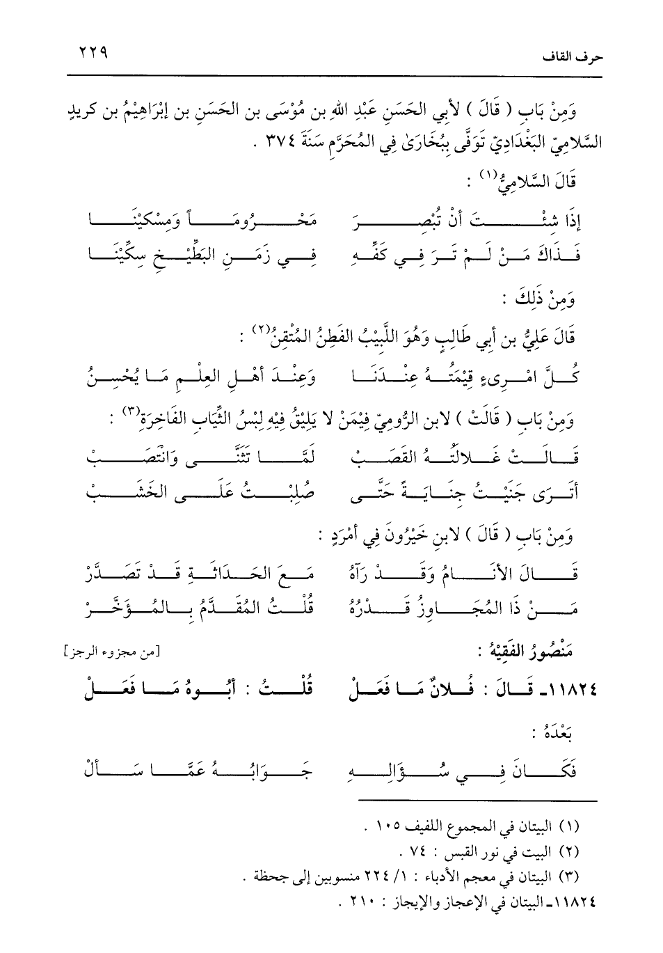 وَمِنْ بَابِ (قَالَ) لأبِي الحَسَنِ عَبْدِ اللَّهِ بن مُوْسَى بن الحَسَنِ بن إبْرَاهِيْمُ بن كريدٍ السَّلامِيّ البَغْدَادِيّ تَوَفَّى بِبُخَارَى فِي المُحَرَّمِ سَنَةَ 374.