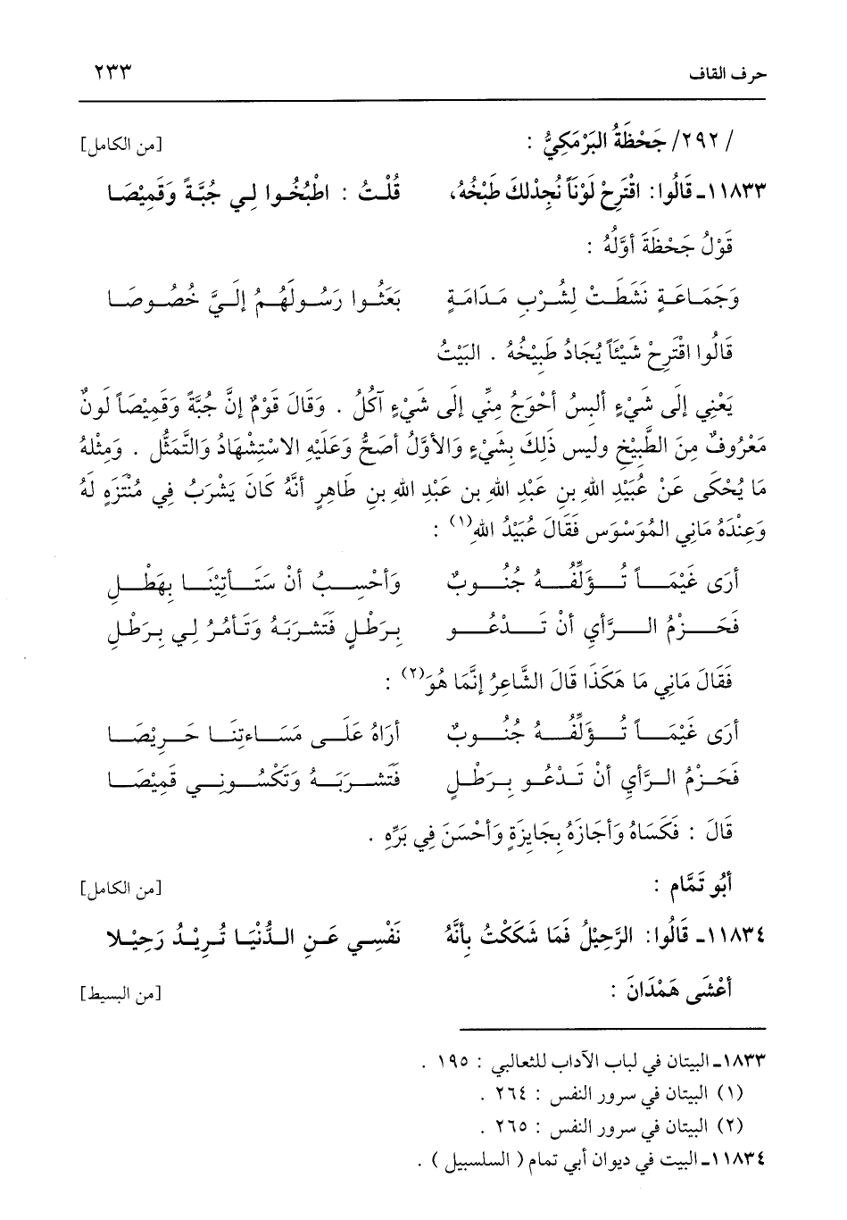 يَعْنِي إِلَى شَيْءٍ ألبسُ أحْوَجُ مِنِّي إِلَى شَيْءٍ آكُلُ. وَقَالَ قَوْمٌ إِنَّ جُبَّةً وَقَمِيْصًا لَونٌ مَعْرُوفٌ مِنَ الطَّبِيْخِ وليَس ذَلِكَ بِشَيْءٍ وَالأوَّلُ أصَحُّ وَعَلَيْهِ الاسْتِشْهَادُ وَالتَّمَثُّل. وَمِثْلهُ مَا يُحْكَى عَنْ عُبَيْدِ اللَّهِ بنِ عَبْدِ اللَّهِ بن عَبْدِ اللَّهِ بنِ طَاهِرٍ أَنَّهُ كَانَ يَشْرَبُ فِي مُنْتَزَهٍ لَهُ وَعِنْدَهُ مَانِي المُوَسْوَس فَقَالَ عُبَيْدُ اللَّهِ (¬1):