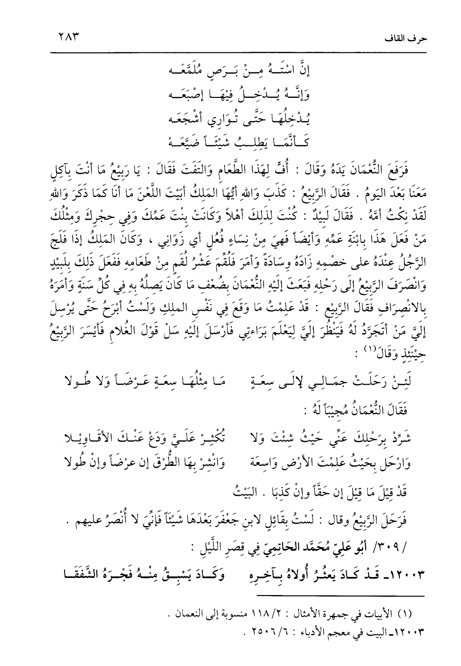 فَرَفَعَ النُّعْمَانَ يَدَهُ وَقَالَ: أُفٍّ لِهَذَا الطَّعَامِ وَالتَفَتَ فَقَالَ: يَا رَبِيْعُ مَا أنْتَ بِآكِلٍ مَعَنَا بَعْدَ اليَومُ. فَقَالَ الرَّبِيع: كَذَبَ وَاللَّهِ أيُّهَا المَلِكُ أبَيْتَ اللَّعْنَ مَا أَنَا كَمَا ذَكَرَ وَاللَّهِ لَقَدْ نِكْتُ أمَّهُ. فَقَالَ لَبِيْدٌ: كُنْتَ لِذَلِكَ أهْلًا وَكَانَتْ بِنْتَ عَمِّكَ وَفِي حِجْرِكَ وَمِثْلُكَ مَنْ فَعَلَ هَذَا بِابْنَةِ عَمِّهِ وَأيْضًا فَهيَ مِنْ نِسَاءٍ فُعُلٍ أي زَوَانِي، وَكَانَ المَلِكُ إِذَا فَلَجَ الرَّجُلُ عِنْدَهُ على خصْمِهِ زَادَهُ وِسَادَةً وَأمَرَ فَلُقِّمَ عَشْرُ لُقَمٍ مِنْ طَعَامِهِ فَفَعَلَ ذَلِكَ بِلَبيْدٍ وَانْصَرَفَ الرَّبِيع إِلَى رَحْلِهِ فَبَعَثَ إلَيْهِ النُّعْمَانَ بِضعْفِ مَا كَانَ يَصلُهُ بِهِ فِي كُلِّ سَنَةٍ وَأَمَرَهُ بِالانْصِرَافِ فَقَالَ الرَّبِيعْ: قَدْ عَلِمْتُ مَا وَقَعَ فِي نَفْسِ الملِكِ وَلَسْتُ أبْرَحُ حَتَّى يُرْسِلَ إلَيَّ مَنْ أتَجَرَّدُ لَهُ فَيَنْظُرَ إلَيَّ لِيَعْلَمَ بَرَاءتِي فَأرْسَلَ إلَيْهِ سَلْ قَوْلَ الغُلامِ فَأيْسَرَ الرَّبِيع حِيْنَئِذٍ وَقَالَ (¬1):