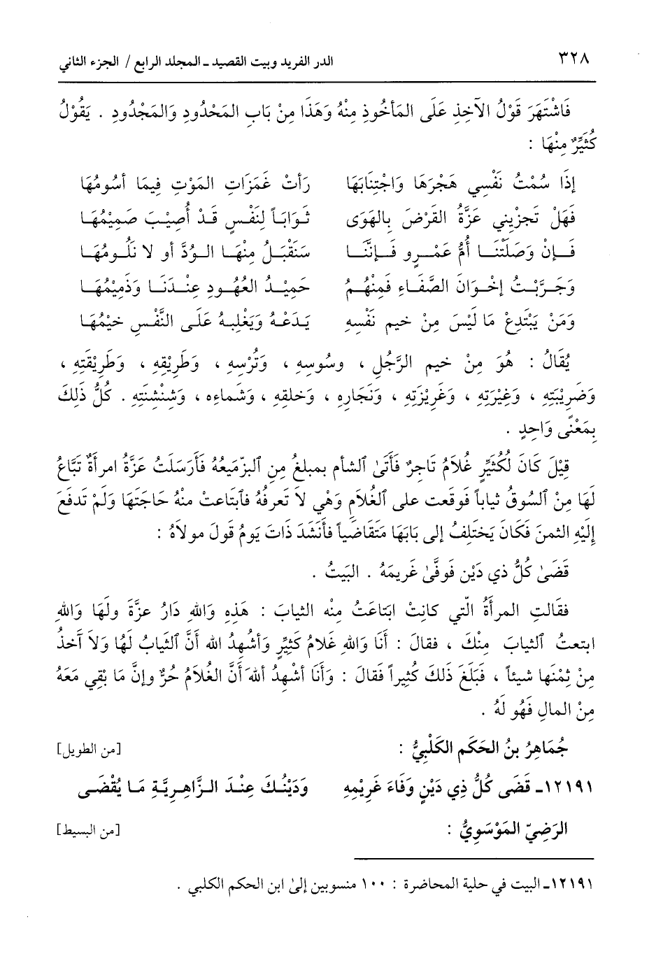 12191 - البيت في حلية المحاضرة: 100 منسوبين إلى ابن الحكم الكلبي.