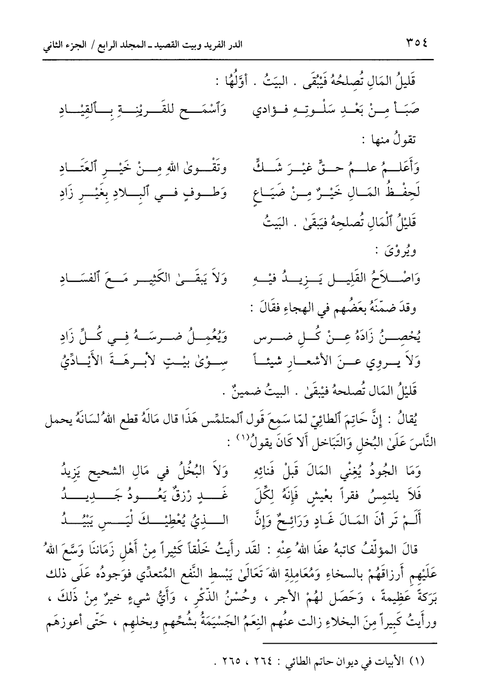 قَليلُ المَالِ تُصلحُهُ فَيْبُقَى. البيَتُ. أوَّلُهُا: