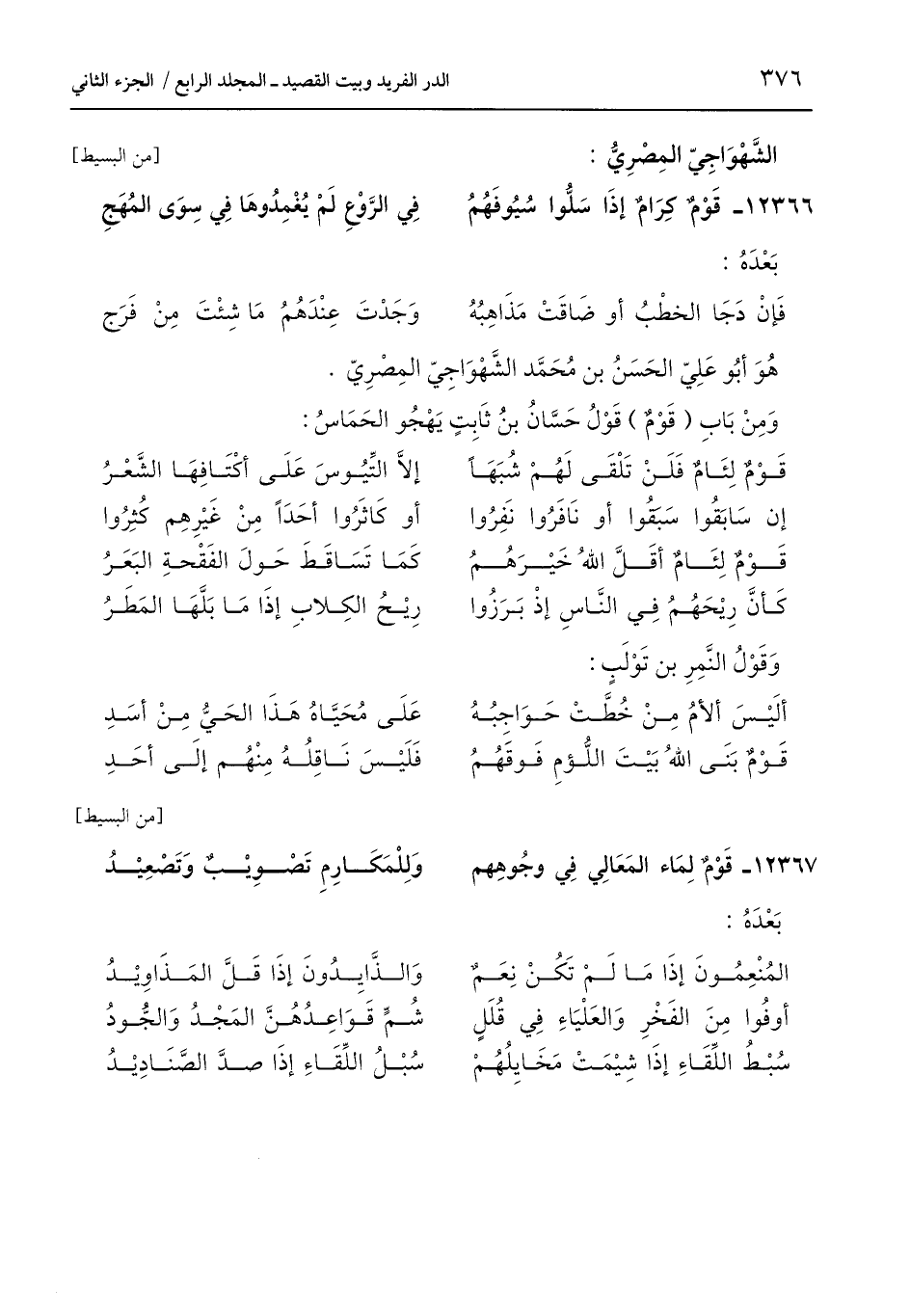 12367 - قَوْمٌ لِمَاء المَعَالِي فِي وجُوهِهم ... وَلِلْمَكَارِمِ تَصوِيْبٌ وَتَصْعِيْدُ