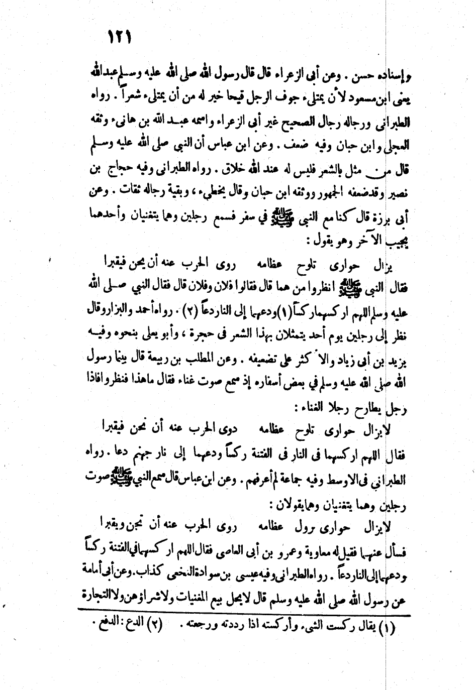 13312 - وَعَنِ الْمُطَّلِبِ بْنِ رَبِيعَةَ قَالَ: «بَيْنَمَا رَسُولُ اللَّهِ - صَلَّى اللَّهُ عَلَيْهِ وَسَلَّمَ - فِي بَعْضِ أَسْفَارِهِ، إِذْ سَمِعَ صَوْتَ غِنَاءٍ فَقَالَ: " مَا هَذَا؟ ". فَنَظَرُوا فَإِذَا رَجُلٌ يُطَارِحُ رَجُلًا الْغِنَاءَ: