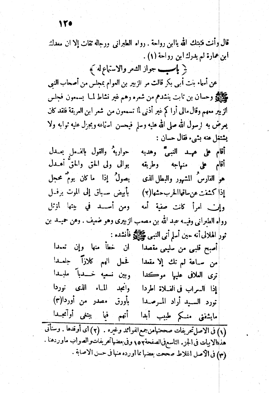 13335 - عَنْ أَسْمَاءَ بِنْتِ أَبِي بَكْرٍ قَالَتْ: «مَرَّ الزُّبَيْرُ بْنُ الْعَوَّامِ بِمَجْلِسٍ مِنْ أَصْحَابِ النَّبِيِّ - صَلَّى اللَّهُ عَلَيْهِ وَسَلَّمَ - وَحَسَّانُ بْنُ ثَابِتٍ يُنْشِدُهُمْ مِنْ شِعْرِهِ، وَهُمْ غَيْرُ نُشَّاطٍ لِمَا يَسْمَعُونَ مِنْهُ، فَجَلَسَ الزُّبَيْرُ مَعَهُمْ وَقَالَ: مَا لِي أَرَاكُمْ غَيْرَ أَذِنِينَ لِمَا تَسْمَعُونَ مِنْ شِعْرِ ابْنِ الْفُرَيْعَةِ؟ فَلَقَدْ كَانَ يَعْرِضُ بِهِ لِرَسُولِ اللَّهِ - صَلَّى اللَّهُ عَلَيْهِ وَسَلَّمَ - فَيُحْسِنُ اسْتِمَاعَهُ، وَيُجْزِلُ عَلَيْهِ ثَوَابَهُ، وَلَا يَشْتَغِلُ عَنْهُ بِشَيْءٍ. فَقَالَ حَسَّانٌ: