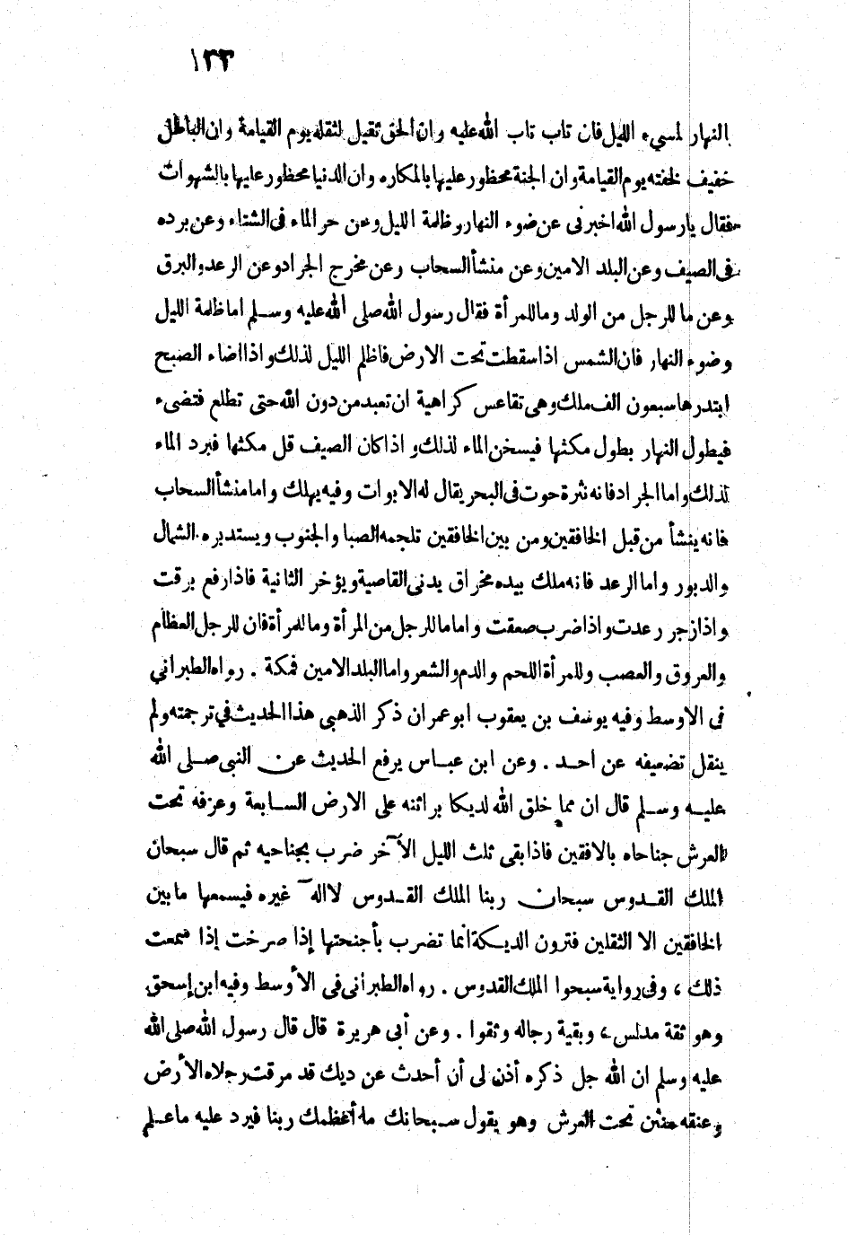 بِالنَّهَارِ لِمُسِيءِ اللَّيْلِ فَإِنْ تَابَ تَابَ اللَّهُ عَلَيْهِ، وَإِنَّ الْحَقَّ ثَقِيلٌ لِثِقَلِهِ يَوْمَ الْقِيَامَةِ، وَإِنَّ الْبَاطِلَ خَفِيفٌ لِخِفَّتِهِ يَوْمَ الْقِيَامَةِ، وَإِنَّ الْجَنَّةَ مَحْظُورٌ عَلَيْهَا بِالْمَكَارِهِ، وَإِنَّ الدُّنْيَا مَحْظُورٌ عَلَيْهَا بِالشَّهَوَاتِ ". فَقَالَ: يَا رَسُولَ اللَّهِ، أَخْبِرْنِي عَنْ ضَوْءِ النَّهَارِ وَظُلْمَةِ اللَّيْلِ، وَعَنْ حَرِّ الْمَاءِ فِي الشِّتَاءِ، وَعَنْ بَرْدِهِ فِي الصَّيْفِ، وَعَنِ الْبَلَدِ الْأَمِينِ، وَعَنْ مَنْشَأِ السَّحَابِ، وَعَنْ مَخْرَجِ الْجَرَادِ، وَعَنِ الرَّعْدِ وَالْبَرْقِ، وَعَنْ مَا لِلرَّجُلِ مِنَ الْوَلَدِ وَمَا لِلْمَرْأَةِ؟ فَقَالَ رَسُولُ اللَّهِ - صَلَّى اللَّهُ عَلَيْهِ وَسَلَّمَ -: " أَمَّا ظُلْمَةُ اللَّيْلِ وَضَوْءُ النَّهَارِ: فَإِنَّ الشَّمْسَ إِذَا سَقَطَتْ سَقَطَتْ تَحْتَ الْأَرْضِ فَأَظْلَمَ اللَّيْلُ لِذَلِكَ، وَإِذَا أَضَاءَ الصُّبْحُ ابْتَدَرَهَا سَبْعُونَ أَلْفَ مَلَكٍ، وَهِيَ تُقَاعِسُ كَرَاهِيَةَ أَنْ تُعْبَدَ مِنْ دُونِ اللَّهِ، حَتَّى تَطْلُعَ فَتُضِيءُ، فَيَطُولُ النَّهَارُ بِطُولِ مُكْثِهَا، فَيَسْخُنُ الْمَاءُ لِذَلِكَ وَإِذَا كَانَ الصَّيْفُ قَلَّ مُكْثُهَا فَبَرُدَ الْمَاءُ لِذَلِكَ. وَأَمَّا الْجَرَادُ: فَإِنَّهُ نَثْرَهُ حُوتٌ فِي الْبَحْرِ يُقَالُ لَهُ: الْأَبْوَاتُ، وَفِيهِ يَهْلَكُ. وَأَمَّا مَنْشَأُ السَّحَابِ: فَإِنَّهُ يَنْشَأُ مِنْ قِبَلِ الْخَافِقَيْنِ، وَمِنْ [بَيْنِ] الْخَافِقَيْنِ تُلْجِمُهُ الصَبَا وَالْجَنُوبُ، وَيَسْتَدْبِرُهُ الشَّمَالُ وَالدَّبُورُ. وَأَمَّا الرَّعْدُ: فَإِنَّهُ مَلَكٌ بِيَدِهِ مِخْرَاقٌ، يُدْنِي الْقَاصِيَةَ وَيُؤَخِّرُ الدَّانِيَةَ، فَإِذَا رَفَعَ بَرَقَتْ، وَإِذَا زَجَرَ رَعَدَتْ، وَإِذَا ضَرَبَ صَعَقَتْ. وَأَمَّا مَا لِلرَّجُلِ مِنَ الْمَرْأَةِ وَمَا لِلْمَرْأَةِ: فَإِنَّ لِلرَّجُلِ الْعِظَامَ وَالْعُرُوقَ وَالْعَصَبَ، وَلِلْمَرْأَةِ اللَّحْمُ وَالدَّمُ وَالشَّعْرُ. وَأَمَّا الْبَلَدُ الْأَمِينُ: فَمَكَّةُ».