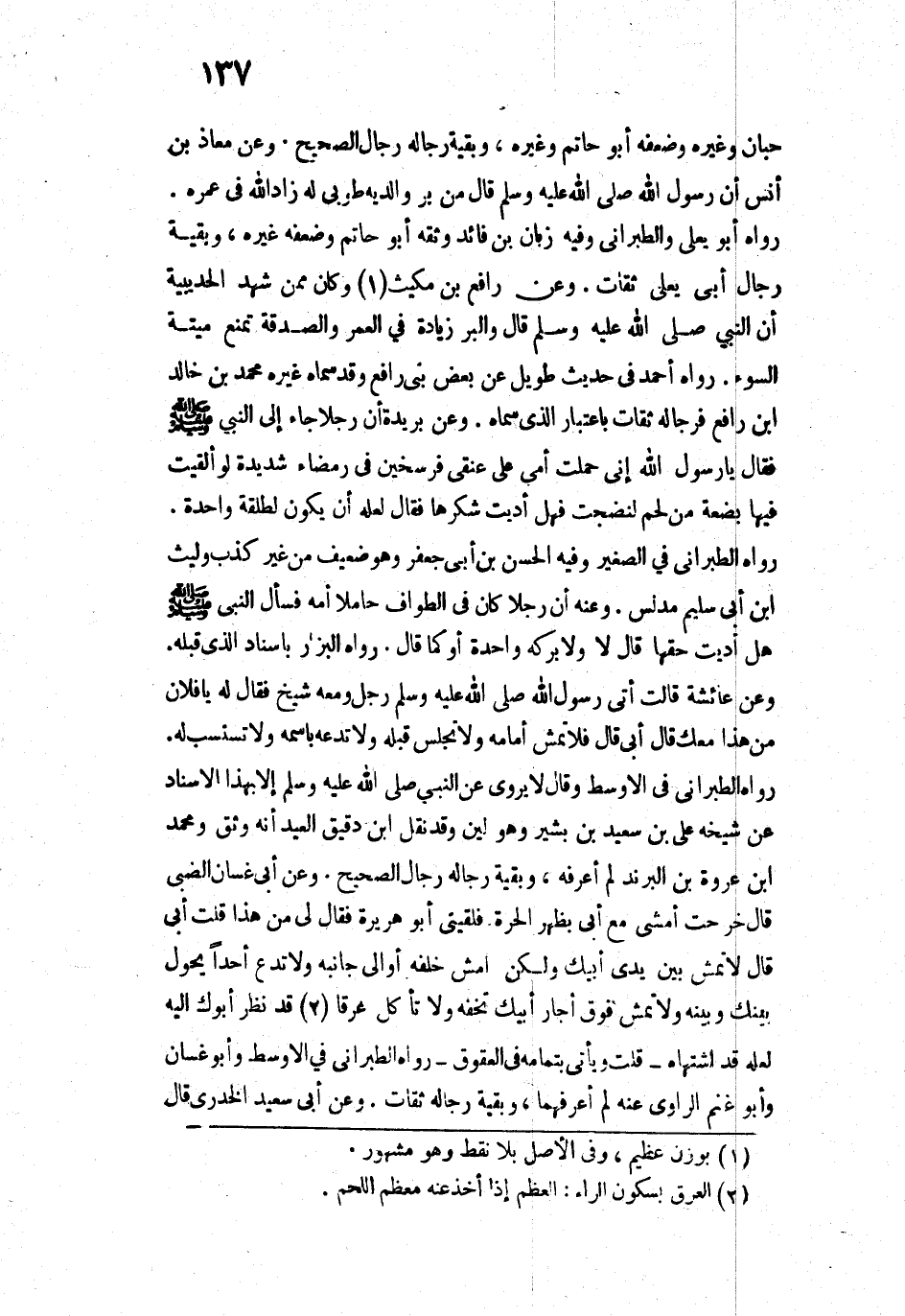 رَوَاهُ الطَّبَرَانِيُّ فِي الْأَوْسَطِ وَقَالَ: لَا يُرْوَى عَنِ النَّبِيِّ - صَلَّى اللَّهُ عَلَيْهِ وَسَلَّمَ - إِلَّا بِهَذَا الْإِسْنَادِ، عَنْ شَيْخِهِ عَلِيِّ بْنِ سَعِيدِ بْنِ بَشِيرٍ وَهُوَ لَيِّنٌ، وَقَدْ نَقَلَ ابْنُ دَقِيقِ الْعِيدِ أَنَّهُ وُثِّقَ، وَمُحَمَّدُ بْنُ عَرْعَرَةَ بْنِ يَزِيدَ لَمْ أَعْرِفْهُ، وَبَقِيَّةُ رِجَالِهِ رِجَالُ الصَّحِيحِ.