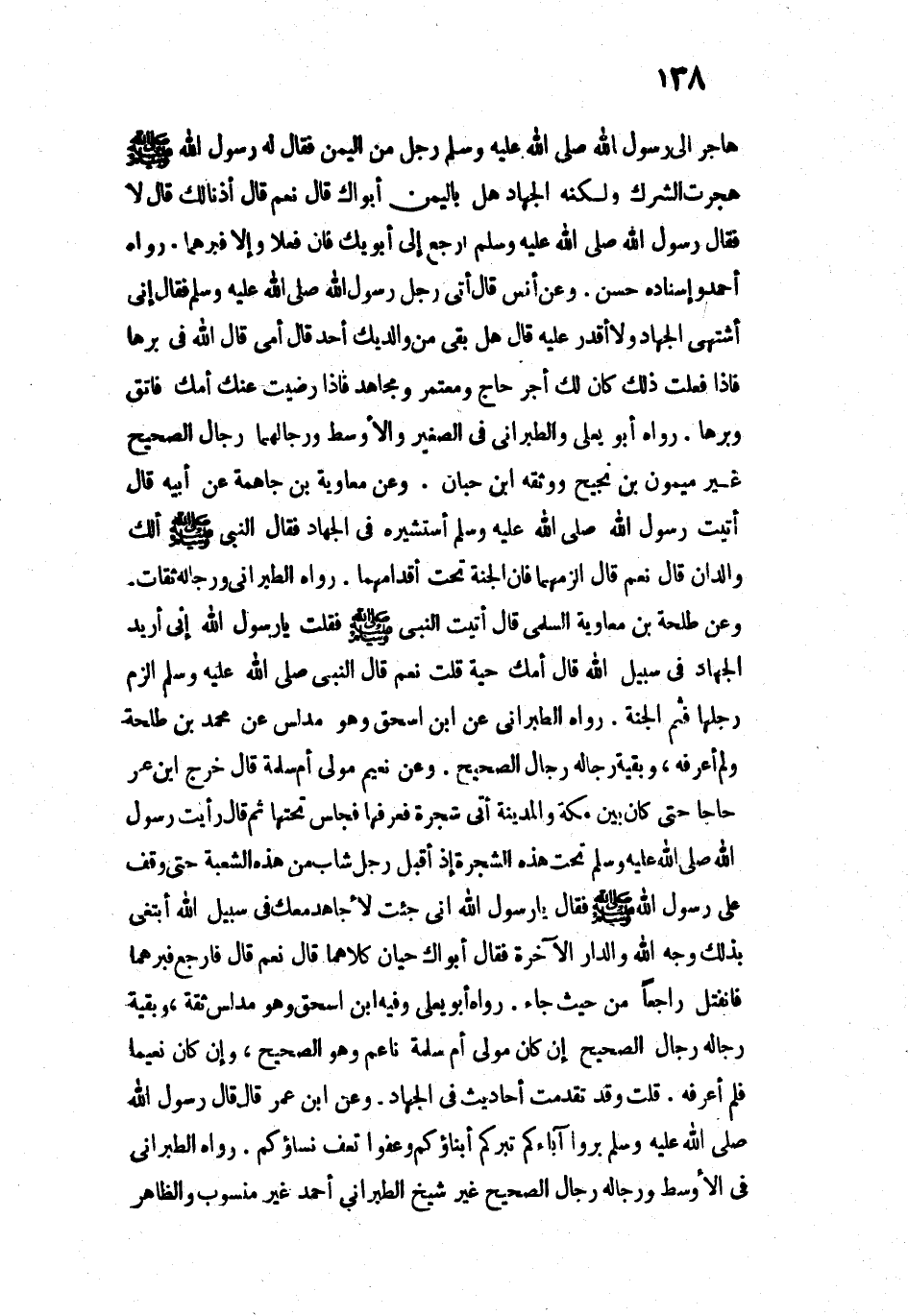 13401 - وَعَنْ طَلْحَةَ بْنِ مُعَاوِيَةَ السُّلَمِيِّ قَالَ: «أَتَيْتُ النَّبِيَّ - صَلَّى اللَّهُ عَلَيْهِ وَسَلَّمَ - فَقُلْتُ: يَا رَسُولَ اللَّهِ، إِنِّي أُرِيدُ الْجِهَادَ فِي سَبِيلِ اللَّهِ. قَالَ: " أُمُّكَ حَيَّةٌ؟ ". قُلْتُ: نَعَمْ. قَالَ النَّبِيُّ - صَلَّى اللَّهُ عَلَيْهِ وَسَلَّمَ -: " الْزَمْ رِجْلَهَا فَثَمَّ الْجَنَّةُ».