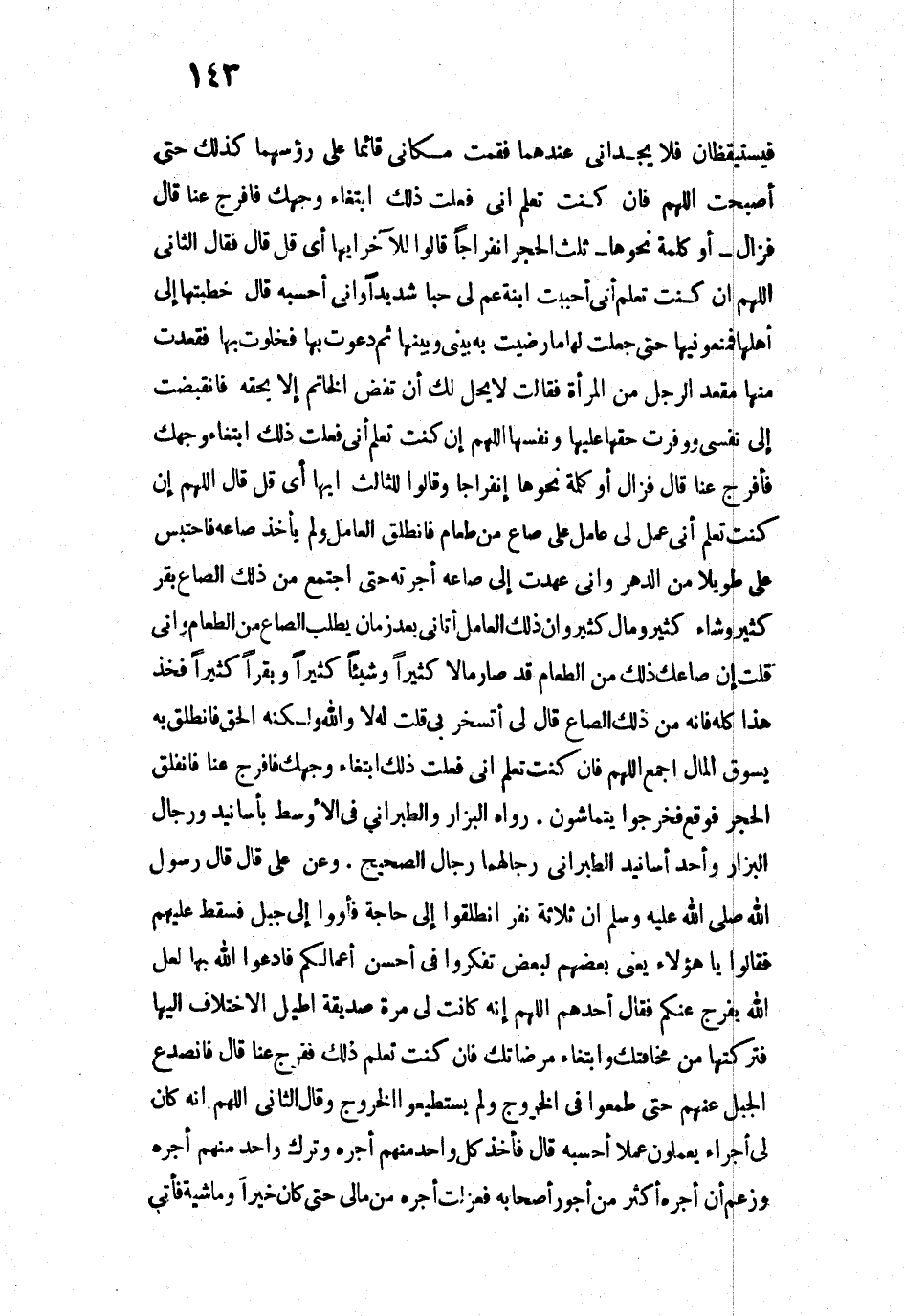 فَيَسْتَيْقِظَانِ فَلَا يَجِدَانِي عِنْدَهُمَا، فَقُمْتُ مَكَانِي قَائِمًا عَلَى رُءُوسِهِمَا كَذَلِكَ، حَتَّى أَصْبَحْتُ، اللَّهُمَّ فَإِنْ كُنْتَ تَعْلَمُ أَنِّي فَعَلْتُ ذَلِكَ ابْتِغَاءَ وَجْهِكَ، فَافْرِجْ عَنَّا. قَالَ: فَزَالَ - أَوْ كَلِمَةً نَحْوَهَا - ثُلُثُ الْحَجَرِ انْفِرَاجًا. قَالُوا لِلْآخَرِ: إِيهًا - أَيْ قُلْ - قَالَ: فَقَالَ الثَّانِي: اللَّهُمَّ إِنْ كُنْتَ تَعْلَمُ أَنِّي أَحْبَبْتُ ابْنَةَ عَمٍّ لِي حُبًّا شَدِيدًا - وَإِنِّي أَحْسَبُهُ قَالَ: - خَطَبْتُهَا إِلَى أَهْلِهَا فَمَنَعُونِيهَا، حَتَّى جَعَلْتُ لَهَا مَا رَضِيتُ بِهِ بَيْنِي وَبَيْنَهَا، ثُمَّ دَعَوْتُ بِهَا فَخَلَوْتُ بِهَا، فَقَعَدْتُ مِنْهَا مَقْعَدَ الرَّجُلِ مِنَ الْمَرْأَةِ فَقَالَتْ: لَا يَحِلُّ لَكَ أَنْ تَفُضَّ الْخَاتَمَ إِلَّا بِحَقِّهِ. فَانْقَبَضْتُ إِلَى نَفْسِي، وَوَفَّرْتُ حَقَّهَا عَلَيْهَا وَنَفْسَهَا، اللَّهُمَّ إِنْ كُنْتَ تَعْلَمُ أَنِّي فَعَلْتُ ذَلِكَ ابْتِغَاءَ وَجْهِكَ فَافْرِجْ عَنَّا. قَالَ: فَزَالَ - أَوْ كَلِمَةً نَحْوَهَا - انْفِرَاجًا. وَقَالُوا لِلثَّالِثِ: إِيهًا - أَيْ قُلْ - قَالَ: اللَّهُمَّ إِنْ كُنْتَ تَعْلَمُ أَنِّي عَمَلَ لِي عَامِلٌ عَلَى صَاعٍ مِنْ طَعَامٍ، فَانْطَلَقَ الْعَامِلُ وَلَمْ يَأْخُذْ صَاعَهُ، فَاحْتَبَسَ عَلَيَّ طَوِيلًا مِنَ الدَّهْرِ، وَإِنِّي عَمَدْتُ إِلَى صَاعِهِ أَحْرُثُهُ، حَتَّى اجْتَمَعَ مِنْ ذَلِكَ الصَّاعِ بَقَرٌ كَثِيرٌ وَشَاءٌ كَثِيرٌ وَمَالٌ كَثِيرٌ، وَإِنَّ ذَلِكَ الْعَامِلَ أَتَانِي بَعْدَ زَمَانٍ يَطْلُبُ الصَّاعَ مِنَ الطَّعَامِ، وَإِنِّي قُلْتُ لَهُ: إِنَّ صَاعَكَ ذَلِكَ مِنَ الطَّعَامِ قَدْ صَارَ مَالًا كَثِيرًا وَشَاءً كَثِيرًا وَبَقَرًا كَثِيرًا، فَخُذْ هَذَا كُلَّهُ فَإِنَّهُ مِنْ ذَلِكَ الصَّاعِ. قَالَ لِي: أَتَسْخَرُ بِي؟ قُلْتُ لَهُ: لَا وَاللَّهِ، وَلَكِنَّهُ الْحَقُّ. فَانْطَلَقَ بِهِ يَسُوقُ الْمَالَ أَجْمَعَ، اللَّهُمَّ فَإِنْ كُنْتَ تَعْلَمُ أَنِّي فَعَلْتُ ذَلِكَ ابْتِغَاءَ وَجْهِكَ فَافْرِجْ عَنَّا. فَانْفَلَقَ الْحَجَرُ فَوَقَعَ، فَخَرَجُوا يَتَمَاشَوْنَ».