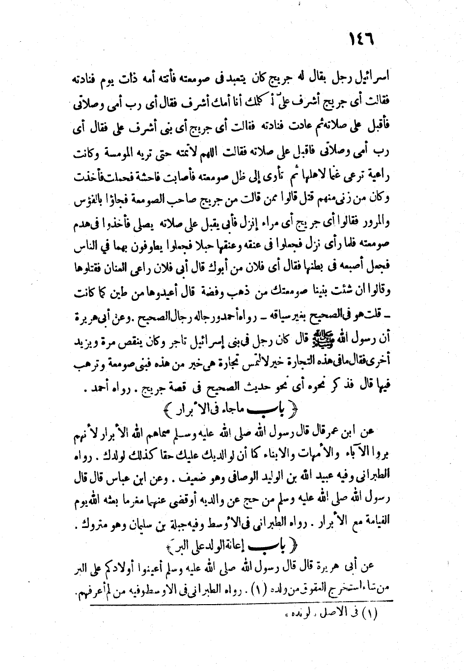 إِسْرَائِيلَ رَجُلٌ يُقَالُ لَهُ: جُرَيْجٌ، كَانَ يَتَعَبَّدُ فِي صَوْمَعَتِهِ، فَأَتَتْهُ أُمُّهُ ذَاتَ يَوْمٍ فَنَادَتْهُ فَقَالَتْ: أَيْ جُرَيْجُ [أَيْ بُنَيَّ]، أَشْرِفْ عَلَيَّ أُكَلِّمْكَ، أَنَا أُمُّكَ، أَشْرِفْ [عَلَيَّ]. فَقَالَ: أَيْ رَبِّ أُمِّي وَصَلَاتِي؟ فَأَقْبَلَ عَلَى صَلَاتِهِ، ثُمَّ عَادَتْ فَنَادَتْهُ [مِرَارًا] فَقَالَتْ: أَيْ جُرَيْجُ، أَيْ بُنَيَّ، أَشْرِفْ عَلَيَّ. فَقَالَ: أَيْ رَبِّ أُمِّي وَصَلَاتِي؟ فَأَقْبَلَ عَلَى صَلَاتِهِ فَقَالَتِ: اللَّهُمَّ لَا تُمِتْهُ حَتَّى تُرِيَهُ الْمُومِسَةَ. وَكَانَتْ رَاعِيَةٌ تَرْعَى غَنَمًا لِأَهْلِهَا، ثُمَّ تَأْوِي إِلَى ظِلِّ صَوْمَعَتِهِ، فَأَصَابَتْ فَاحِشَةً، فَحَمَلَتْ فَأُخِذَتْ، وَكَانَ مَنْ زَنَى مِنْهُمْ قُتِلَ، قَالُوا: مِمَّنْ؟ قَالَتْ: مِنْ جُرَيْجٍ صَاحِبِ الصَّوْمَعَةِ. فَجَاؤُوا بِالْفُئُوسِ وَالْمُرُورِ، فَقَالُوا: أَيْ جُرَيْجُ، أَيْ مُرَاءٍ [ثُمَّ قَالُوا]، انْزِلْ. فَأَبَى، يُقْبِلُ عَلَى صَلَاتِهِ يُصَلِّي. فَأَخَذُوا فِي هَدْمِ صَوْمَعَتِهِ، فَلَمَّا رَأَى ذَلِكَ نَزَلَ، فَجَعَلُوا فِي عُنُقِهِ وَعُنُقِهَا حَبْلًا، فَجَعَلُوا يَطُوفُونَ بِهِمَا فِي النَّاسِ، فَجَعَلَ إِصْبَعَهُ فِي بَطْنِهَا فَقَالَ: أَيْ فُلَانُ، مَنْ أَبُوكَ؟ قَالَ: أَبِي فُلَانٌ رَاعِي الضَّأْنِ. فَقَبَّلُوهُ وَقَالُوا: إِنْ شِئْتَ بَنَيْنَا صَوْمَعَتَكَ مِنْ ذَهَبٍ وَفِضَّةٍ. قَالَ: أَعِيدُوهَا مِنْ طِينٍ كَمَا كَانَتْ». قُلْتُ: هُوَ فِي الصَّحِيحِ بِغَيْرِ سِيَاقِهِ.