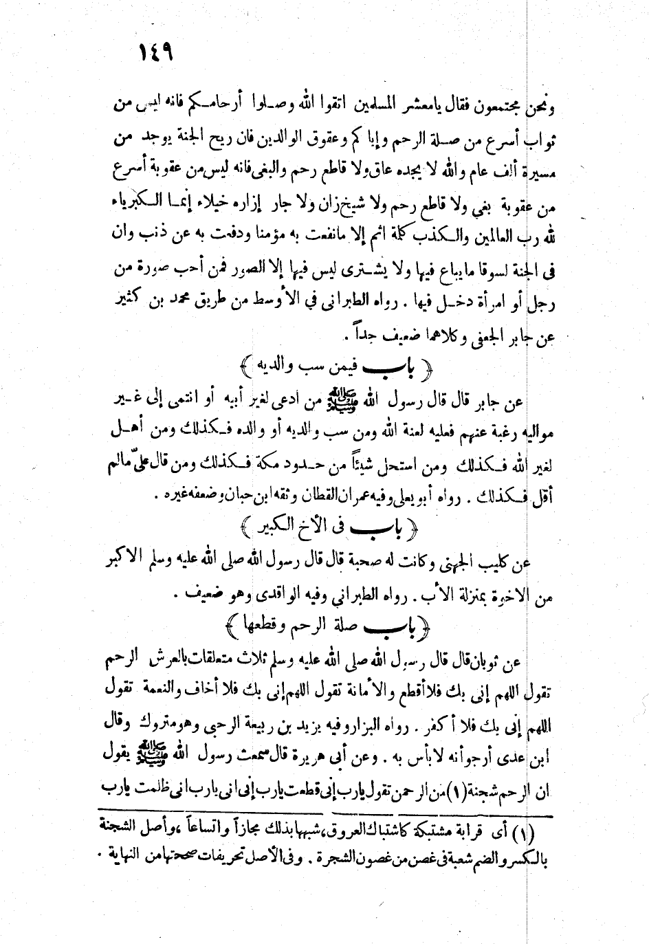 وَنَحْنُ مُجْتَمِعُونَ فَقَالَ: " يَا مَعْشَرَ الْمُسْلِمِينَ، اتَّقُوا اللَّهَ وَصِلُوا أَرْحَامَكُمْ، فَإِنَّهُ لَيْسَ مِنْ ثَوَابٍ أَسْرَعُ مِنْ صِلَةِ الرَّحِمِ، وَإِيَّاكُمْ وَعُقُوقَ الْوَالِدَيْنِ فَإِنَّ رِيحَ الْجَنَّةِ يُوجَدُ مِنْ مَسِيرَةِ أَلْفِ عَامٍ، وَاللَّهِ لَا يَجِدُهَا عَاقٌّ وَلَا قَاطِعُ رَحِمٍ، وَالْبَغْيُ فَإِنَّهُ لَيْسَ مِنْ عُقُوبَةٍ أَسْرَعُ مِنْ عُقُوبَةِ بَغْيٍ [وَلَا قَاطِعِ رَحِمٍ]، وَلَا شَيْخٍ زَانٍ، وَلَا جَارٍّ إِزَارَهُ خُيَلَاءَ، إِنَّمَا الْكِبْرِيَاءُ لِلَّهِ رَبِّ الْعَالَمِينَ، وَالْكَذِبُ كُلُّهُ إِثْمٍ إِلَّا مَا نَفَعْتَ بِهِ مُؤْمِنًا وَدَفَعْتَ بِهِ عَنْ ذَنْبٍ، وَإِنَّ فِي الْجَنَّةِ لَسُوقًا مَا يُبَاعُ فِيهَا وَلَا يُشْتَرَى، لَيْسَ فِيهَا إِلَّا الصُّوَرُ، فَمَنْ أَحَبَّ صُورَةً مِنْ رَجُلٍ أَوِ امْرَأَةٍ دَخَلَ فِيهَا».