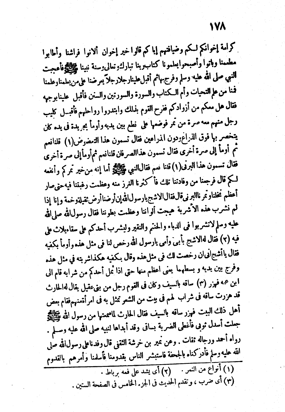 كَرَامَةَ إِخْوَانِكُمْ لَكُمْ وَضِيَافَتَهُمْ إِيَّاكُمْ؟ ". قَالُوا: خَيْرَ إِخْوَانٍ أَلَانُوا فِرَاشَنَا، وَأَطَابُوا مَطْعَمَنَا، وَبَاتُوا وَأَصْبَحُوا يُعَلِّمُونَا كِتَابَ رَبِّنَا تَبَارَكَ وَتَعَالَى وَسُنَّةَ نَبِيِّنَا - صَلَّى اللَّهُ عَلَيْهِ وَسَلَّمَ. فَأَعْجَبَتِ النَّبِيَّ - صَلَّى اللَّهُ عَلَيْهِ وَسَلَّمَ - وَفَرِحَ بِهَا، ثُمَّ أَقْبَلَ عَلَيْنَا رَجُلًا رَجُلًا يَعْرِضُنَا عَلَى مَنْ يُعَلِّمُنَا وَعَلَّمَنَا، فَمِنَّا مَنْ عُلِّمَ التَّحِيَّاتِ وَأُمَّ الْكِتَابِ وَالسُّورَةَ وَالسُّورَتَيْنِ وَالسُّنَنَ، فَأَقْبَلَ عَلَيْنَا بِوَجْهِهِ فَقَالَ: " هَلْ مَعَكُمْ مَنْ أَزْوَادِكُمْ؟ ". فَفَرِحَ الْقَوْمُ بِذَلِكَ وَابْتَدَرُوا رَوَاحِلَهُمْ، فَأَقْبَلَ كُلُّ رَجُلٍ مِنْهُمْ مَعَهُ صُبْرَةٌ مِنْ تَمْرٍ فَوَضَعَهَا عَلَى نِطْعٍ بَيْنَ يَدَيْهِ، وَأَوْمَأَ بِجَرِيدَةٍ فِي يَدِهِ كَانَ يَتَخَصَّرُ بِهَا فَوْقَ الذِّرَاعِ وَدُونَ الذِّرَاعَيْنِ فَقَالَ: " تُسَمُّونَ هَذَا التَّعْضُوضَ؟ ". قُلْنَا: نَعَمْ. ثُمَّ أَوْمَأَ إِلَى صُبْرَةٍ أُخْرَى فَقَالَ: " تُسَمُّونَ هَذَا الصَّرَفَانَ؟ ". قُلْنَا: نَعَمْ. ثُمَّ أَوْمَأَ إِلَى صُبْرَةٍ أُخْرَى فَقَالَ: " تُسَمُّونَ هَذَا الْبَرْنِيَّ؟ ". قُلْنَا: نَعَمْ. فَقَالَ النَّبِيُّ - صَلَّى اللَّهُ عَلَيْهِ وَسَلَّمَ -: " أَمَا إِنَّهُ مِنْ خَيْرِ تَمْرِكُمْ وَأَنْفَعِهِ لَكُمْ ". قَالَ: فَرَجَعْنَا مِنْ وِفَادَتِنَا تِلْكَ، فَأَكْثَرْنَا الْغَرْزَ مِنْهُ، وَعَظُمَتْ رَغْبَتُنَا فِيهِ، حَتَّى صَارَ أَعْظَمُ نَخْلِنَا وَتَمْرِنَا الْبَرْنِيُّ. قَالَ: فَقَالَ الْأَشَجُّ: يَا رَسُولَ اللَّهِ، إِنَّ أَرْضَنَا أَرْضٌ ثَقِيلَةٌ وَخِمَةٌ، وَإِنَّا إِذَا لَمْ نَشْرَبْ هَذِهِ الْأَشْرِبَةَ هُيِّجَتْ أَلْوَانُنَا وَعَظُمَتْ بُطُونُنَا. فَقَالَ رَسُولُ اللَّهِ - صَلَّى اللَّهُ عَلَيْهِ وَسَلَّمَ -: " لَا تَشْرَبُوا فِي الدُّبَّاءِ وَالْحَنْتَمِ وَالنَّقِيرِ، وَلْيَشْرَبْ أَحَدُكُمْ عَلَى سِقَاءٍ يُلَاثُ عَلَى فِيهِ ". فَقَالَ لَهُ الْأَشَجُّ: بِأَبِي وَأُمِّي يَا رَسُولَ اللَّهِ، رَخِّصْ لَنَا فِي مِثْلِ هَذِهِ، وَأَوْمَأَ بِكَفَّيْهِ. فَقَالَ: " يَا أَشَجُّ، إِنِّي إِنْ رَخَّصْتُ لَكَ فِي مِثْلِ هَذِهِ - وَقَالَ بِكَفَّيْهِ هَكَذَا - شَرِبْتَهُ فِي مِثْلِ هَذِهِ ". وَفَرَّجَ بَيْنَ يَدَيْهِ وَبَسَطَهُمَا - يَعْنِي أَعْظَمَ مِنْهَا " حَتَّى إِذَا ثَمِلَ أَحَدُكُمْ مِنْ شَرَابِهِ قَامَ إِلَى ابْنِ عَمِّهِ فَهَزَرَ (ضَرَبَ) سَاقَهُ بِالسَّيْفِ ". وَكَانَ فِي الْقَوْمِ رَجُلٌ مِنْ بَنِي عَضَلٍ يُقَالُ لَهُ: الْحَارِثُ، قَدْ هُزِرَتْ سَاقُهُ فِي شَرَابٍ لَهُمْ، فِي بَيْتٍ مِنَ الشِّعْرِ تَمَثَّلَ بِهِ فِي امْرَأَةٍ مِنْهُمْ، فَقَامَ بَعْضُ أَهْلِ ذَلِكَ الْبَيْتِ فَهَزَرَ سَاقَهُ بِالسَّيْفِ، فَقَالَ الْحَارِثُ: لَمَّا سَمِعْتُهَا مِنْ رَسُولِ اللَّهِ - صَلَّى اللَّهُ عَلَيْهِ وَسَلَّمَ - جَعَلْتُ أُسْدِلُ ثَوْبِي فَأُغَطِّي الضَّرْبَةَ بِسَاقِي وَقَدْ أَبْدَاهَا اللَّهُ لِنَبِيِّهِ - صَلَّى اللَّهُ عَلَيْهِ وَسَلَّمَ».
