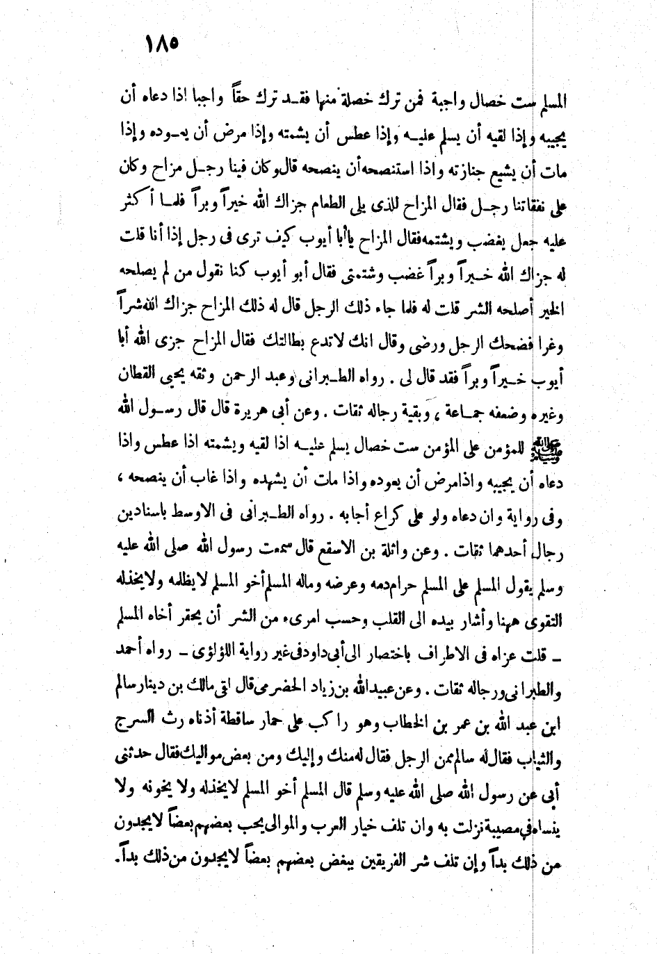 الْمُسْلِمِ سِتُّ خِصَالٍ وَاجِبَةٍ، فَمَنْ تَرَكَ خَصْلَةً مِنْهَا فَقَدْ تَرَكَ حَقًّا وَاجِبًا: إِذَا دَعَاهُ أَنْ يُجِيبَهُ، وَإِذَا لَقِيَهُ أَنْ يُسَلِّمَ عَلَيْهِ، وَإِذَا عَطَسَ أَنْ يُشَمِّتَهُ، وَإِذَا مَرِضَ أَنْ يَعُودَهُ، وَإِذَا مَاتَ أَنْ يُشَيِّعَ جِنَازَتَهُ، وَإِذَا اسْتَنْصَحَهُ أَنْ يَنْصَحَهُ» ". قَالَ: وَكَانَ فِينَا رَجُلٌ مَزَّاحٌ، وَكَانَ عَلَى نَفَقَاتِنَا رَجُلٌ، فَقَالَ الْمَزَّاحُ لِلَّذِي يَلِي الطَّعَامَ: جَزَاكَ اللَّهُ خَيْرًا وَبِرًّا. فَلَمَّا أَكْثَرَ عَلَيْهِ جَعَلَ يَغْضَبُ وَيَشْتُمُهُ، فَقَالَ الْمَزَّاحُ: يَا أَبَا أَيُّوبَ، كَيْفَ تَرَى فِي رَجُلٍ إِذَا أَنَا قُلْتُ لَهُ: جَزَاكَ اللَّهُ خَيْرًا وَبِرًّا، غَضِبَ وَشَتَمَنِي؟ فَقَالَ أَبُو أَيُّوبَ: كُنَّا نَقُولُ: مَنْ لَمْ يُصْلِحْهُ الْخَيْرُ أَصْلَحَهُ الشَّرُّ قُلْتُ لَهُ. فَلَمَّا جَاءَ ذَلِكَ الرَّجُلُ قَالَ لَهُ ذَلِكَ الْمَزَّاحُ: جَزَاكَ اللَّهُ شَرًّا وَغُرًّا. فَضَحِكَ الرَّجُلُ وَرَضِيَ وَقَالَ: إِنَّكَ لَا تَدَعُ بِطَالَتَكَ فَقَالَ الْمَزَّاحُ: جَزَى اللَّهُ أَبَا أَيُّوبَ خَيْرًا وَبِرًّا فَقَدْ قَالَ لِي.