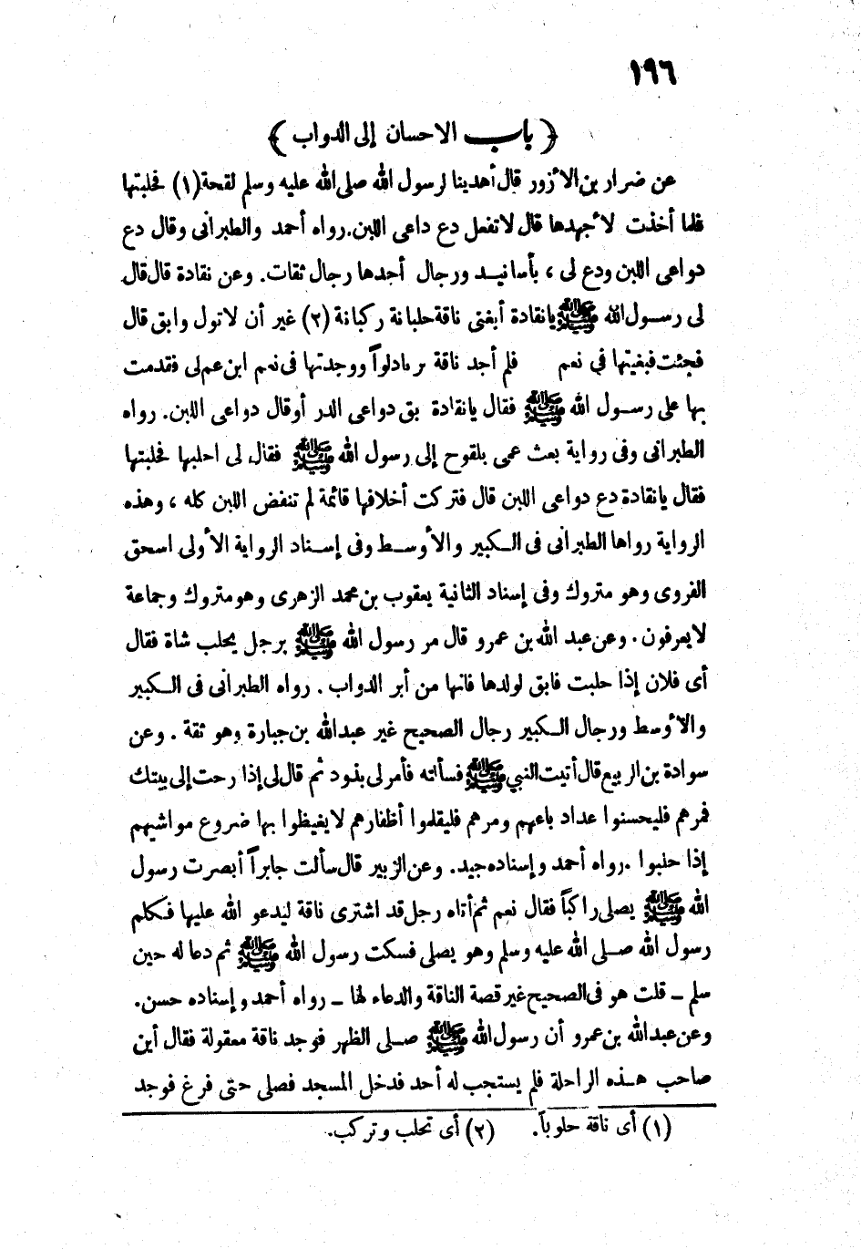 13743 - وَعَنْ عَبْدِ اللَّهِ بْنِ عَمْرٍو قَالَ: «مَرَّ رَسُولُ اللَّهِ - صَلَّى اللَّهُ عَلَيْهِ وَسَلَّمَ - بِرَجُلٍ يَحْلِبُ شَاةً فَقَالَ: " أَيْ فُلَانُ، إِذَا حَلَبْتَ فَأَبْقِ لِوَلَدِهَا فَإِنَّهَا مِنْ أَبَرِّ الدَّوَابِّ» ".