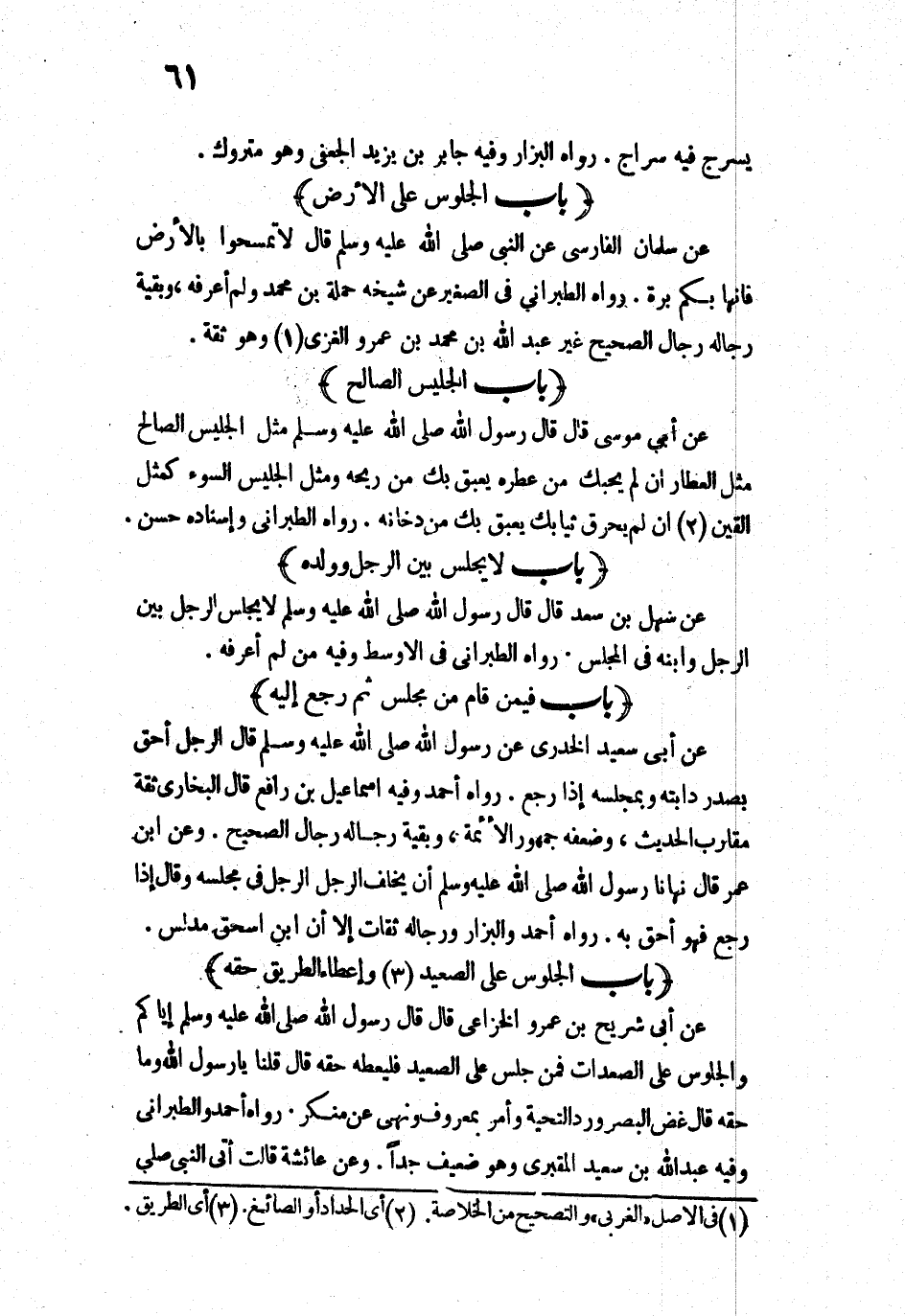 «إِيَّاكُمْ وَالْجُلُوسَ عَلَى الصُّعُدَاتِ، فَمَنْ جَلَسَ عَلَى الصَّعِيدِ فَلْيُعْطِهِ حَقَّهُ ".