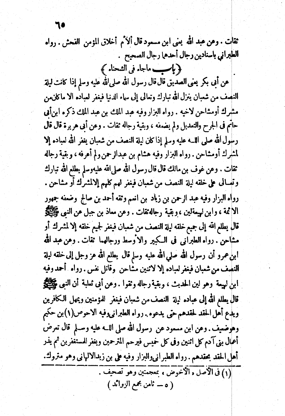 " «يَطَّلِعُ اللَّهُ عَزَّ وَجَلَّ إِلَى خَلْقِهِ لَيْلَةَ النِّصْفِ مِنْ شَعْبَانَ، فَيَغْفِرُ لِعِبَادِهِ إِلَّا لِاثْنَيْنِ: مُشَاحِنٍ، وَقَاتِلِ نَفْسٍ» ".
