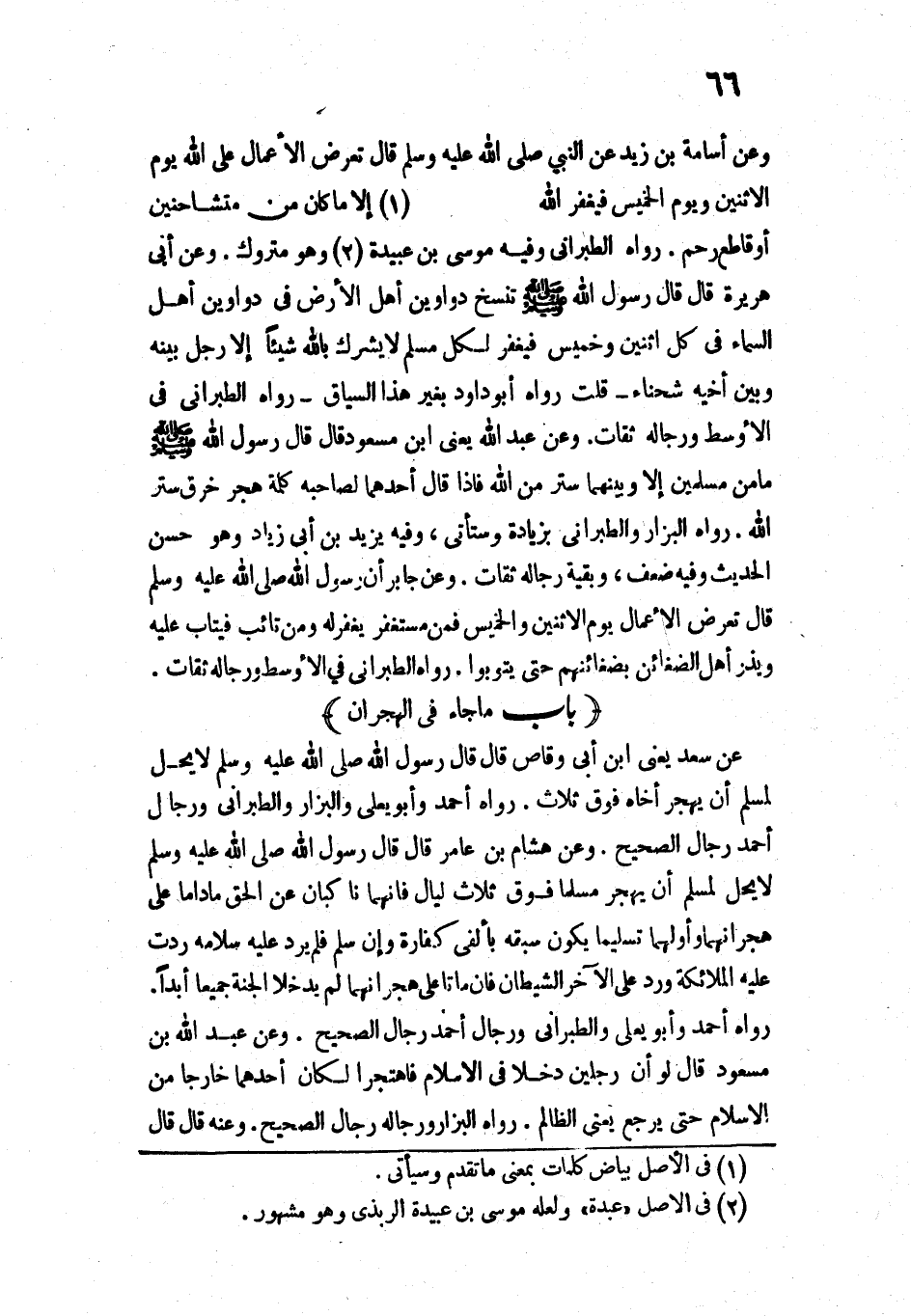 " «لَا يَحِلُّ لِمُسْلِمٍ أَنْ يَهْجُرَ مُسْلِمًا فَوْقَ ثَلَاثِ لَيَالٍ، فَإِنَّهُمَا نَاكِبَانِ عَنِ الْحَقِّ مَا دَامَا عَلَى صِرَامِهِمَا، وَأَوَّلُهُمَا تَسْلِيمًا يَكُونُ سَبَقَهُ بِأَلْفَيْ كَفَّارَةٍ، وَإِنْ سَلَّمَ فَلَمْ يَقْبِلْ عَلَيْهِ سَلَامَهُ رَدَّتْ عَلَيْهِ الْمَلَائِكَةُ، وَرَدَّ عَلَى الْآخَرِ الشَّيْطَانُ، فَإِنْ مَاتَا عَلَى صِرَامِهِمَا لَمْ يَدْخُلَا الْجَنَّةَ جَمِيعًا أَبَدًا» ".