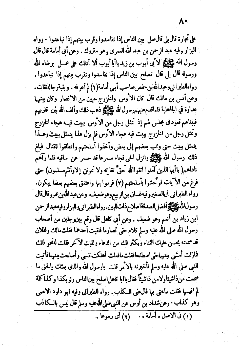 وَقَعَ بَيْنَ رَجُلَيْنِ مِنْ أَصْحَابِ رَسُولِ اللَّهِ - صَلَّى اللَّهُ عَلَيْهِ وَسَلَّمَ - كَلَامٌ حَتَّى تَصَارَمَا، فَلَقِيتُ أَحَدَهُمَا فَقُلْتُ: مَا لَكَ وَلِفُلَانٍ؟ قَدْ سَمِعْتُهُ يُحْسِنُ عَلَيْكَ الثَّنَاءَ، وَيُكْثِرُ لَكَ مِنَ الدُّعَاءِ. وَلَقِيتُ الْآخَرَ فَقُلْتُ لَهُ نَحْوَ ذَلِكَ، فَمَا زِلْتُ أَمْشِي بَيْنَهُمَا حَتَّى اصْطَلَحَا. فَقُلْتُ: مَا فَعَلْتُ؟ أَهْلَكْتُ نَفْسِي، وَأَصْلَحْتُ بَيْنَهُمَا. فَأَتَيْتُ النَّبِيَّ - صَلَّى اللَّهُ عَلَيْهِ وَسَلَّمَ - فَأَخْبَرْتُهُ بِالْأَمْرِ، قُلْتُ: يَا رَسُولَ اللَّهِ، وَالَّذِي بَعَثَكَ بِالْحَقِّ مَا سَمِعْتُ مِنْ ذَا شَيْئًا وَلَا مِنْ ذَا شَيْئًا. فَقَالَ: " يَا أَبَا كَاهِلٍ، أَصْلِحْ بَيْنَ النَّاسِ وَلَوْ بِكَذَا وَكَذَا - كَلِمَةٌ لَمْ أَفْهَمْهَا - فَقُلْتُ: مَا عَنَى بِهَا؟ قَالَ: عَنَى الْكَذِبَ».