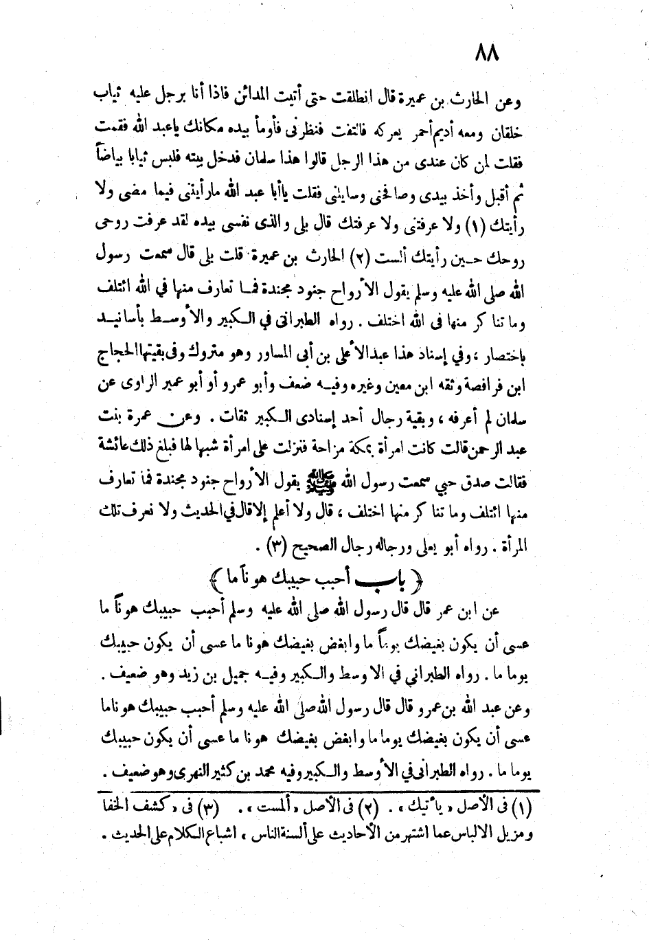 13101 - «وَعَنِ الْحَارِثِ بْنِ عُمَيْرَةَ قَالَ: انْطَلَقْتُ حَتَّى أَتَيْتُ الْمَدَائِنَ، فَإِذَا أَنَا بَرَجُلٍ عَلَيْهِ ثِيَابٌ خُلْقَانٌ، وَمَعَهُ أَدِيمٌ أَحْمَرُ يَعْرِكُهُ، فَالْتَفَتَ فَنَظَرَ إِلَيَّ، فَأَوْمَأَ بِيَدِهِ: مَكَانَكَ يَا عَبْدَ اللَّهِ. فَقُمْتُ، فَقُلْتُ لِمَنْ كَانَ عِنْدِي: مَنْ هَذَا الرَّجُلُ؟ قَالُوا: هَذَا سَلْمَانُ، فَدَخَلَ بَيْتَهُ فَلَبِسَ ثِيَابًا بَيَاضًا، ثُمَّ أَقْبَلَ، وَأَخَذَ بِيَدِي، وَصَافَحَنِي وَسَايَلَنِي، فَقُلْتُ: يَا أَبَا عَبْدِ اللَّهِ، مَا رَأَيْتَنِي فِيمَا مَضَى وَلَا رَأَيْتُكَ، وَلَا عَرَفْتَنِي وَلَا عَرَفْتُكَ. قَالَ: بَلَى وَالَّذِي نَفْسِي بِيَدِهِ، لَقَدْ عَرَفَتْ رُوحِي رُوحَكَ حِينَ رَأَيْتُكَ، أَلَسْتَ الْحَارِثَ بْنَ عُمَيْرَةَ؟ قُلْتُ: بَلَى قَالَ: سَمِعْتُ رَسُولَ اللَّهِ - صَلَّى اللَّهُ عَلَيْهِ وَسَلَّمَ - يَقُولُ: " الْأَرْوَاحُ جُنُودٌ مُجَنَّدَةٌ، فَمَا تَعَارَفَ مِنْهَا فِي اللَّهِ ائْتَلَفَ، وَمَا تَنَاكَرَ مِنْهَا فِي اللَّهِ اخْتَلَفَ» ".