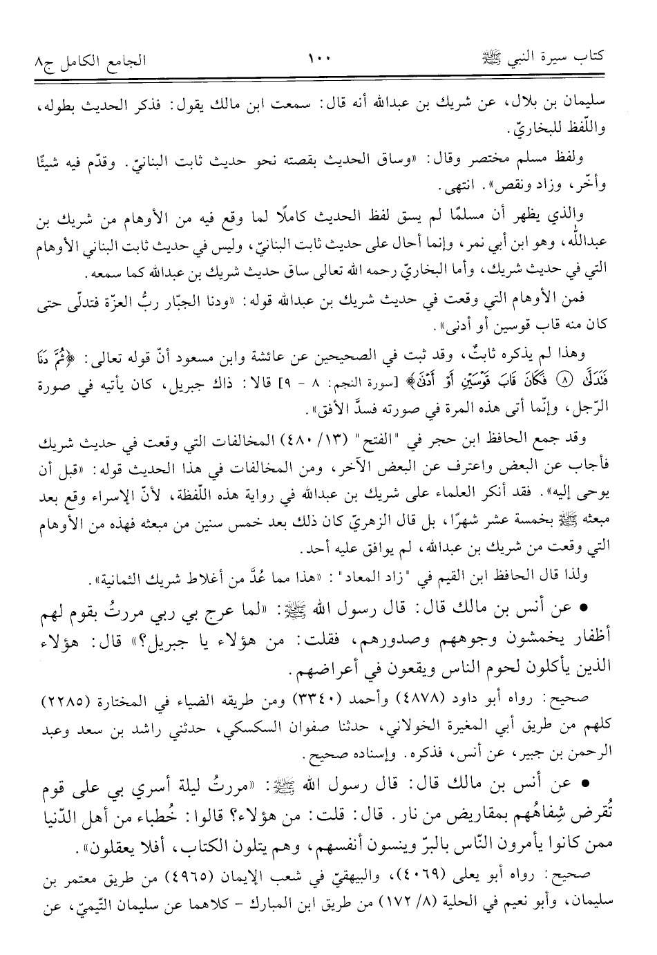 وهذا لم يذكره ثابتٌ، وقد ثبت في الصحيحين عن عائشة وابن مسعود أنّ قوله تعالى: {ثُمَّ دَنَا فَتَدَلَّى (٨) فَكَانَ قَابَ قَوْسَيْنِ أَوْ أَدْنَى (٩)} [سورة النجم: ٨، ٩] قالا: ذاك جبريل، كان يأتيه في صورة الرّجل، وإنّما أتى هذه المرة في صورته فسدَّ الأفق".