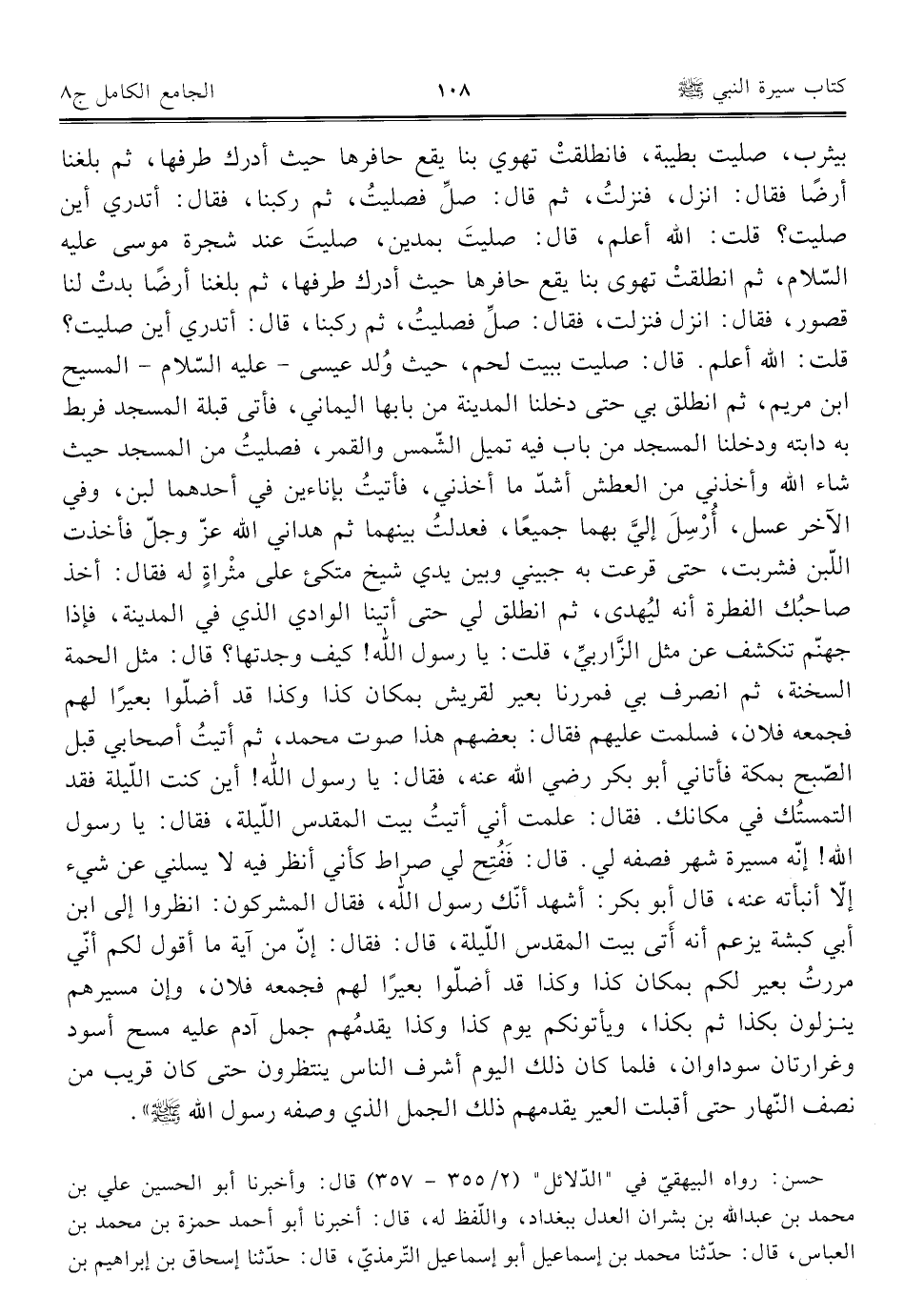 بيثرب، صليت بطيبة، فانطلقتْ تهوي بنا يقع حافرها حيث أدرك طرفها، ثم بلغنا أرضًا فقال: انزل، فنزلتُ، ثم قال: صلِّ فصليتُ، ثم ركبنا، فقال: أتدري أين صليت؟ قلت: الله أعلم، قال: صليتَ بمدين، صليتَ عند شجرة موسى عليه السّلام، ثم انطلقتْ تهوى بنا يقع حافرها حيث أدرك طرفها، ثم بلغنا أرضًا بدتْ لنا قصور، فقال: انزل فنزلت، فقال: صلِّ فصليتُ، ثم ركبنا، قال: أتدري أين صليت؟ قلت: الله أعلم. قال: صليت ببيت لحم، حيث وُلد عيسى - عليه السّلام - المسيح ابن مريم، ثم انطلق بي حتى دخلنا المدينة من بابها اليماني، فأتى قبلة المسجد فربط به دابته ودخلنا المسجد من باب فيه تميل الشّمس والقمر، فصليتُ من المسجد حيث شاء الله وأخذني من العطش أشدّ ما أخذني، فأتيتُ بإناءين في أحدهما لبن، وفي الآخر عسل، أُرْسِلَ إليَّ بهما جميعًا، فعدلتُ بينهما ثم هداني الله عزّ وجلّ فأخذت اللّبن فشربت، حتى قرعت به جبيني وبين يدي شيخ متكئ على مثْراةٍ له فقال: أخذ صاحبُك الفطرة أنه ليُهدى، ثم انطلق لي حتى أتينا الوادي الذي في المدينة، فإذا جهنّم تنكشف عن مثل الزَّاربيِّ، قلت: يا رسول الله! كيف وجدتها؟ قال: مثل الحمة السخنة، ثم انصرف بي فمررنا بعير لقريش بمكان كذا وكذا قد أضلّوا بعيرًا لهم فجمعه فلان، فسلمت عليهم فقال: بعضهم هذا صوت محمد، ثم أتيتُ أصحابي قبل الصبح بمكة فأتاني أبو بكر رضي الله عنه، فقال: يا رسول الله! أين كنت اللّيلة فقد التمستُك في مكانك. فقال: علمت أني أتيتُ بيت المقدس اللّيلة، فقال: يا رسول الله! إنّه مسيرة شهر فصفه لي. قال: فَفُتِح لي صراط كأني أنظر فيه لا يسلني عن شيء إلّا أنبأته عنه، قال أبو بكر: أشهد أنّك رسول الله، فقال المشركون: انظروا إلى ابن أبي كبشة يزعم أنه أَتى بيت المقدس اللّيلة، قال: فقال: إنّ من آية ما أقول لكم أنّي مررتُ بعير لكم بمكان كذا وكذا قد أضلّوا بعيرًا لهم فجمعه فلان، وإن مسيرهم ينزلون بكذا ثم بكذا، ويأتونكم يوم كذا وكذا يقدمُهم جمل آدم عليه مسح أسود وغرارتان سوداوان، فلما كان ذلك اليوم أشرف الناس ينتظرون حتى كان قريب من نصف النّهار حتى أقبلت العير يقدمهم ذلك الجمل الذي وصفه رسول الله - صلى الله عليه وسلم -".