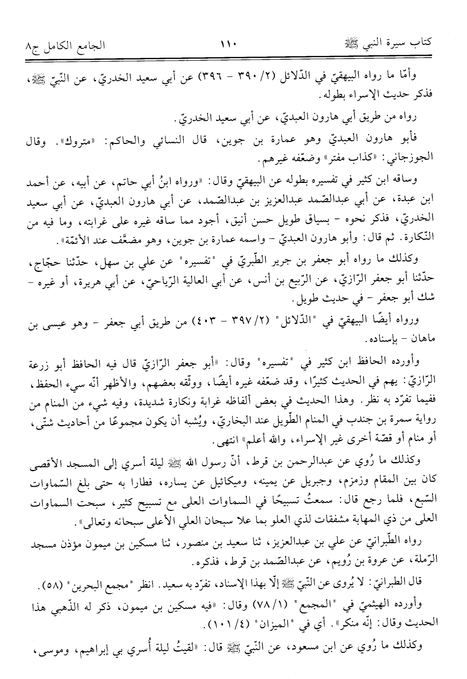 وأورده الحافظ ابن كثير في "تفسيره" وقال: "أبو جعفر الرّازيّ قال فيه الحافظ أبو زرعة الرّازيّ: يهم في الحديث كثيرًا، وقد ضعّفه غيره أيضًا، ووثّقه بعضهم، والأظهر أنّه سيء الحفظ، ففيما تفرّد به نظر. وهذا الحديث في بعض ألفاظه غرابة ونكارة شديدة، وفيه شيء من المنام من رواية سمرة بن جندب في المنام الطّويل عند البخاريّ، ويُشبه أن يكون مجموعًا من أحاديث شتّى، أو منام أو قصّة أخرى غير الإسراء، والله أعلم" انتهى.