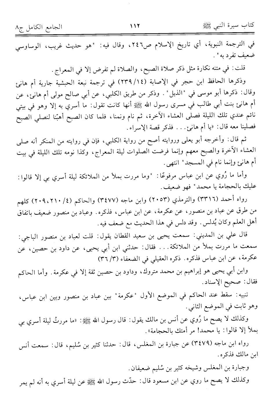 ثم قال: وأخرجه أبو يعلى وروايته أصح من رواية الكلبي، فإن في روايته من المنكر أنه صلى العشاء الآخرة والصبح معهم وإنما فرضت الصلوات ليلة المعراج، وكذا نومه تلك الليلة في بيت أم هانئ وإنما نام في المسجد" انتهى.