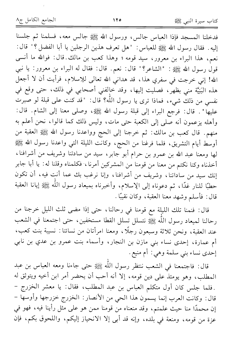فدخلنا المسجد فإذا العباس جالس، ورسول الله - صلى الله عليه وسلم - جالس معه، فسلمنا ثم جلسنا إليه. فقال رسول الله - صلى الله عليه وسلم - للعباس: "هل تعرف هذين الرجلين يا أبا الفضل؟ " قال: نعم، هذا البراء بن معرور، سيد قومه؛ وهذا كعب بن مالك. قال: فوالله ما أنسى قول رسول الله - صلى الله عليه وسلم -: "الشاعر؟ " قال: نعم. قال: فقال له البراء بن معرور: يا نبي الله! إني خرجت في سفري هذا، قد هداني الله تعالى للإسلام، فرأيت أن لا أجعل هذه البَنيَّة مني بظهر، فصليت إليها، وقد خالفني أصحابي في ذلك، حتى وقع في نفسي من ذلك شيءٌ، فماذا ترى يا رسول الله - صلى الله عليه وسلم -؟ قال: "قد كنت على قبلة لو صبرت عليها". قال: فرجع البراء إلى قبلة رسول الله - صلى الله عليه وسلم -، وصلى معنا إلى الشام. قال: وأهله يزعمون أنه صلى إلى الكعبة حتى مات، وليس ذلك كما قالوا، نحن أعلم به منهم. قال كعب بن مالك: ثم خرجنا إلى الحج وواعدنا رسول الله - صلى الله عليه وسلم - العقبة من أوسط أيام التشريق، فلما فرغنا من الحج، وكانت الليلة التي واعدنا رسول الله - صلى الله عليه وسلم - لها ومعنا عبد الله بن عمرو بن حرام أبو جابر، سيد من سادتنا وشريف من أشرافنا، أخذناه وكنا نكتم من معنا من قومنا من المشركين أمرنا، فكلمناه وقلنا له: يا أبا جابر إنك سيد من ساداتنا، وشريف من أشرافنا، وإنا نرغب بك عما أنت فيه، أن تكون حطبًا للنار غدًا، ثم دعوناه إلى الإسلام، وأخبرناه بميعاد رسول الله - صلى الله عليه وسلم - إيانا العقبة قال: فأسلم وشهد معنا العقبة، وكان نقيبًا.