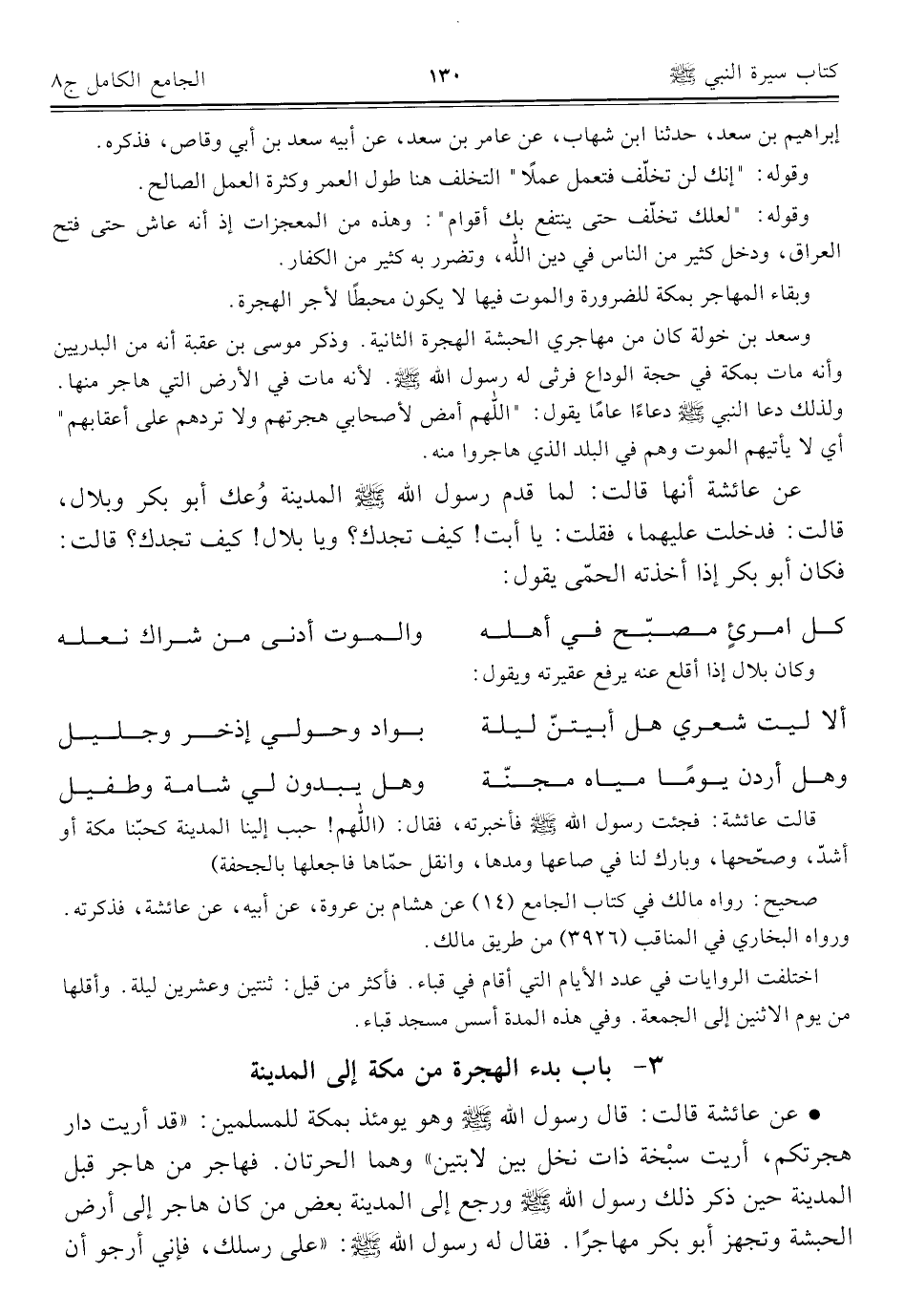 • عن عائشة قالت: قال رسول الله - صلى الله عليه وسلم - وهو يومئذ بمكة للمسلمين: "قد أريت دار هجرتكم، أريت سبْخة ذات نخل بين لابتين" وهما الحرتان. فهاجر من هاجر قبل المدينة حين ذكر ذلك رسول الله - صلى الله عليه وسلم - ورجع إلى المدينة بعض من كان هاجر إلى أرض الحبشة وتجهز أبو بكر مهاجرًا. فقال له رسول الله - صلى الله عليه وسلم -: "على رسلك، فإني أرجو أن