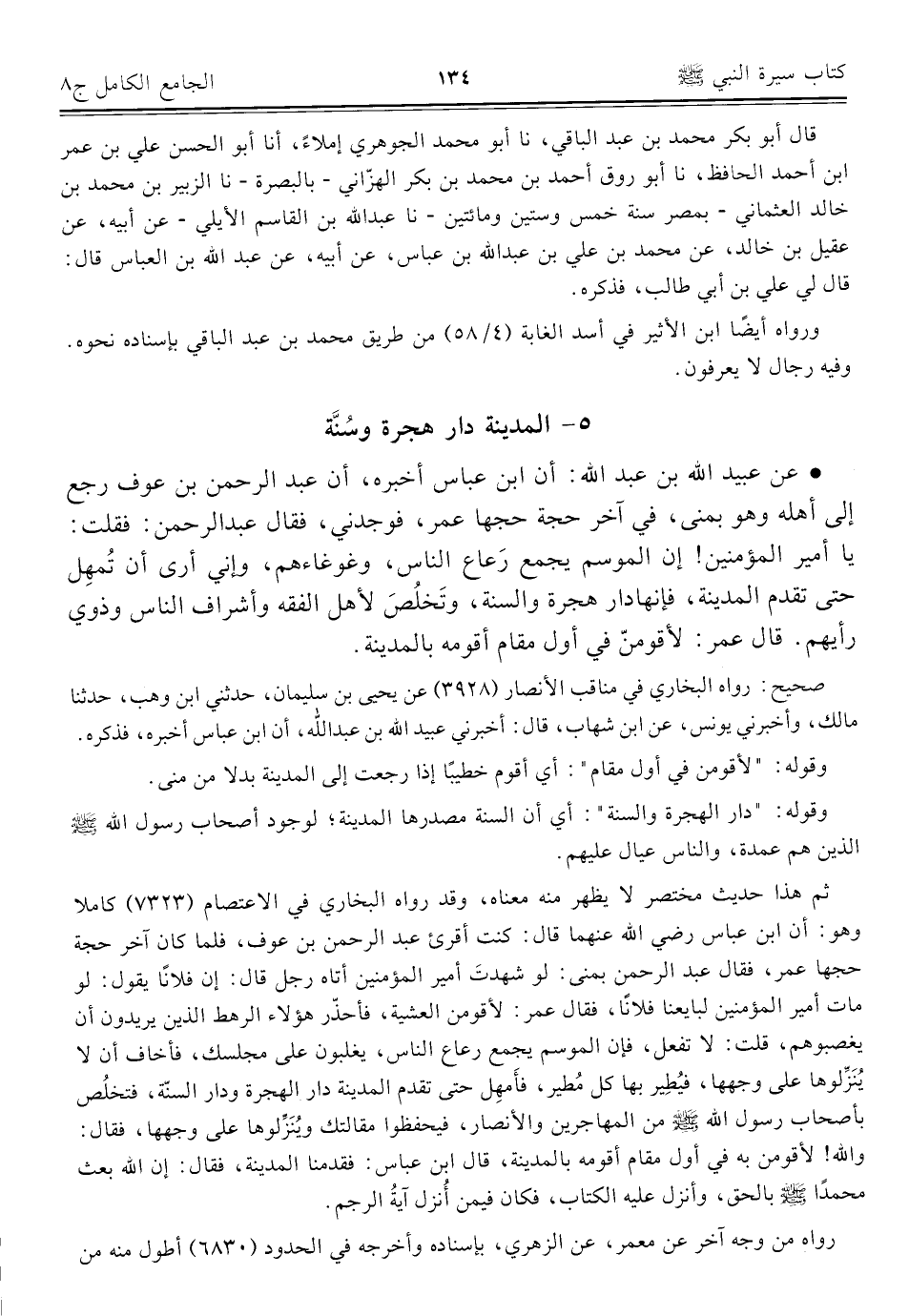 • عن عبيد الله بن عبد الله: أن ابن عباس أخبره، أن عبد الرحمن بن عوف رجع إلى أهله وهو بمنى، في آخر حجة حجها عمر، فوجدني، فقال عبد الرحمن: فقلت: يا أمير المؤمنين! إن الموسم يجمع رَعاع الناس، وغوغاءهم، وإني أرلى أن تُمهِل حتى تقدم المدينة، فإنها دار هجرة والسنة، وتَخلُصَ لأهل الفقه وأشراف الناس وذوي رأيهم. قال عمر: لأقومنّ في أول مقام أقومه بالمدينة.