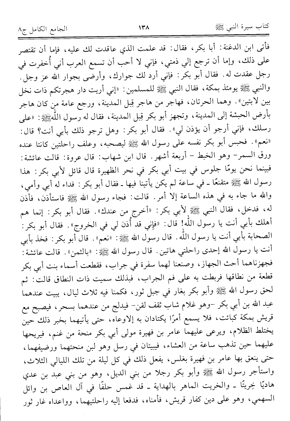 فأتى ابن الدغنة: أبا بكر، فقال: قد علمت الذي عاقدت لك عليه، فإما أن تقتصر على ذلك، وإما أن ترجع إلي ذمتي، فإني لا أحب أن تسمع العرب أني أُخفرت في رجل عقدت له. فقال أبو بكر: فإني أرد لك جوارك، وأرضى بجوار الله عز وجل. والنبي - صلى الله عليه وسلم - يومئذ بمكة، فقال النبي - صلى الله عليه وسلم - للمسلمين: "إني أريت دار هجرتكم ذات نخل بين لابتين". وهما الحرتان، فهاجر من هاجر قِبل المدينة، ورجع عامة من كان هاجر بأرض الحبشة إلى المدينة، وتجهز أبو بكر قِبل المدينة، فقال له رسول الله - صلى الله عليه وسلم -: "على رسلك، فإني أرجو أن يؤذن لي". فقال أبو بكر: وهل ترجو ذلك بأبي أنت؟ قال: "نعم". فحبس أبو بكر نفسه على رسول الله - صلى الله عليه وسلم - ليصحبه، وعلف راحلتين كانتا عنده ورق السمر - وهو الخبط - أربعة أشهر. قال ابن شهاب: قال عروة: قالت عائشة: فبينما نحن يومًا جلوس في بيت أبي بكر في نحر الظهيرة قال قائل لأبي بكر: هذا رسول الله - صلى الله عليه وسلم - متقنعًا - في ساعة لم يكن يأتينا فيها - فقال أبو بكر: فداء له أبي وأمي، والله ما جاء به في هذه الساعة إلا أمر. قالت: فجاء رسول الله - صلى الله عليه وسلم - فاستأذن، فأذن له، فدخل، فقال النبي - صلى الله عليه وسلم - لأبي بكر: "أخرج من عندك". فقال أبو بكر: إنما هم أهلك بأبي أنت يا رسول الله! قال: "فإِني قد أُذن لي في الخروج". فقال أبو بكر: الصحابة بأبي أنت يا رسول الله. قال رسول الله - صلى الله عليه وسلم -: "نعم". قال أبو بكر: فخذ بأبي أنت يا رسول الله إحدى راحلتي هاتين. قال رسول الله - صلى الله عليه وسلم -: "بالثمن". قالت عائشة: فجهزناهما أحث الجهاز، وصنعنا لهما سفرة في جراب، فقطعت أسماء بنت أبي بكر قطعة من نطاقها فربطت به على فم الجراب، فبذلك سميت ذات النطاق قالت: ثم لحق رسول الله - صلى الله عليه وسلم - وأبو بكر بغار في جبل ثور، فكمنا فيه ثلاث ليال، يبيت عندهما عبد الله بن أبي بكر - وهو غلام شاب ثقف لقن - فيدلج من عندهما بسحر، فيصبح مع قريش بمكة كبائت، فلا يسمع أمرًا يكتادان به إلاوعاه، حتى يأتيهما بخبر ذلك حين يختلط الظلام، ويرعى عليهما عامر بن فهيرة مولى أبي بكر منحة من غنم، فيريحها عليهما حين تذهب ساعة من العشاء، فيبيتان في رسل وهو لبن منحتهما ورضيفهما، حتى ينعق بها عامر بن فهيرة بغلس، يفعل ذلك في كل ليلة من تلك الليالي الثلاث، واستأجر رسول الله - صلى الله عليه وسلم - وأبو بكر رجلا من بني الديل، وهو من بني عبد بن عدي هاديًا خِريتًا - والخريت الماهر بالهداية - قد غمس حلفًا في آل العاص بن وائل السهمي، وهو على دين كفار قريش، فأمناه، فدفعا إليه راحلتيهما، وواعداه غار ثور