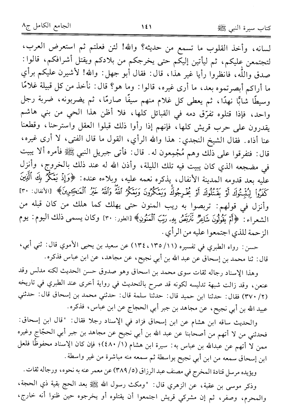 لسانه، وأخذ القلوب ما تسمع من حديثه؟ والله! لئن فعلتم ثم استعرض العرب، لتجتمعن عليكم، ثم ليأتين إليكم حتى يخرجكم من بلادكم ويقتل أشرافكم، قالوا: صدق والله، فانظروا رأيا غير هذا، قال: فقال أبو جهل: والله! لأشيرن عليكم برأي ما أراكم أبصرتموه بعد، ما أرى غيره، قالوا: وما هو؟ قال: نأخذ من كل قبيلة غلامًا وسيطًا شابًّا نهدًا، ثم يعطى كل غلام منهم سيفًا صارمًا، ثم يضربونه، ضربة رجل واحد، فإذا قتلوه تفرّق دمه في القبائل كلها، فلا أظن هذا الحي من بني هاشم يقدرون على حرب قريش كلها، فإنهم إذا رأوا ذلك قبلوا العقل واسترحنا، وقطعنا عنا أذاه. فقال الشيخ النجدي: هذا والله الرأي، القول ما قال الفتى، لا أرى غيره، قال: فتفرقوا على ذلك وهم مُجْمِعون له. قال: فأتى جبريل النبي - صلى الله عليه وسلم - فأمره ألا يبيت في مضجعه الذي كان يبيت فيه تلك الليلة، وأذن الله له عند ذلك بالخروج، وأنزل عليه بعد قدومه المدينة الأنفال، يذكره نعمه عليه، وبلاءه عنده: {وَإِذْ يَمْكُرُ بِكَ الَّذِينَ كَفَرُوا لِيُثْبِتُوكَ أَوْ يَقْتُلُوكَ أَوْ يُخْرِجُوكَ وَيَمْكُرُونَ وَيَمْكُرُ اللَّهُ وَاللَّهُ خَيْرُ الْمَاكِرِينَ} [الأنفال: ٣٠] وأنزل في قولهم: تربصوا به ريب المنون حتى يهلك كما هلك من كان قبله من الشعراء: {أَمْ يَقُولُونَ شَاعِرٌ نَتَرَبَّصُ بِهِ رَيْبَ الْمَنُونِ} [الطور: ٣٠] وكان يسمى ذلك اليوم: يوم الزحمة للذي اجتمعوا عليه من الرأي.