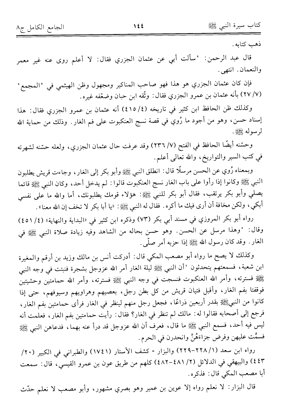 وكذلك ظن الحافظ ابن كثير في تاريخه (٤/ ٤١٥) أنه عثمان بن عمرو الجزري فقال: هذا إسناد حسن، وهو من أجود ما رُوي في قصة نسج العنكبوت على فم الغار. وذلك من حماية الله لرسوله - صلى الله عليه وسلم -.