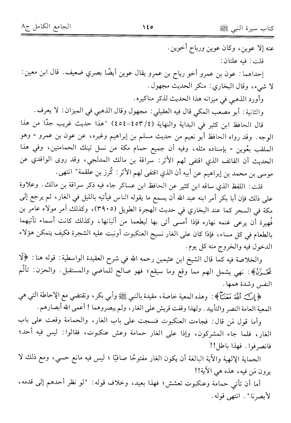 قلت: اللفظ الذي ساقه ابن كثير عن الحافظ ابن عساكر جاء فيه ذكر سراقة بن مالك. وعلاوة على ذلك فإن أبا بكر أمر ابنه عبد الله أن يسمع ما يقوله الناس فيأتيه بالليل في الغار، ثم يرجع إلى مكة في السحر كما عند البخاري في حديث الهجرة الطويل (٣٩٠٥)، وكذلك أمر مولاه عامر بن فُهيرة أن يرعى غنمه نهاره فإذا أمسى أتى بها ليطعما من ألبانها، وكذلك كانت أسماء تأتيهما بالطعام في كل مساء، فإذا كان على الغار نسيج العنكبوت أونبت عليه الشجرة فكيف يتمكن هؤلاء الدخول فيه والخروج منه كل يوم.