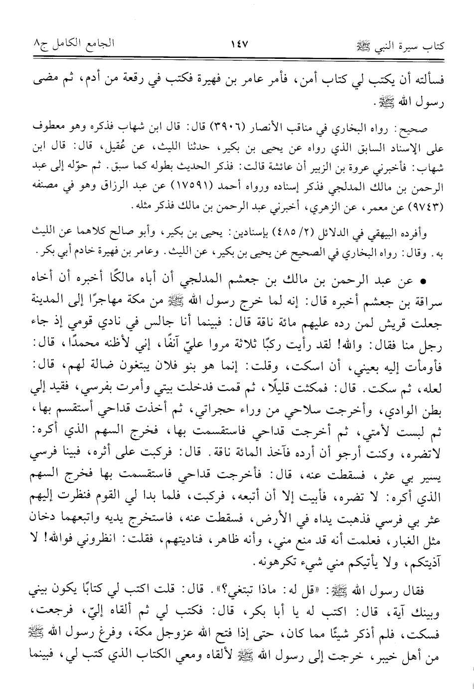 • عن عبد الرحمن بن مالك بن جعشم المدلجي أن أباه مالكًا أخبره أن أخاه سراقة بن جعشم أخبره قال: إنه لما خرج رسول الله - صلى الله عليه وسلم - من مكة مهاجرًا إلى المدينة جعلت قريش لمن رده عليهم مائة ناقة قال: فبينما أنا جالس في نادي قومي إذ جاء رجل منا فقال: والله! لقد رأيت ركبًا ثلاثة مروا عليّ آنفًا، إني لأظنه محمدًا، قال: فأومأت إليه بعيني، أن اسكت، وقلت: إنما هو بنو فلان يبتغون ضالة لهم، قال: لعله، ثم سكت. قال: فمكثت قليلًا، ثم قمت فدخلت بيتي وأمرت بفرسي، فقيد إلي بطن الوادي، وأخرجت سلاحي من وراء حجراتي، ثم أخذت قداحي أستقسم بها، ثم لبست لأمتي، ثم أخرجت قداحي فاستقسمت بها، فخرج السهم الذي أكره: لا تضره، وكنت أرجو أن أرده فآخذ المائة ناقة. قال: فركبت على أثره، فبينا فرسي يسير بي عثر، فسقطت عنه، قال: فأخرجت قداحي فاستقسمت بها فخرج السهم الذي أكره: لا تضره، فأبيت إلا أن أتبعه، فركبت، فلما بدا لي القوم فنظرت إليهم عثر بي فرسي فذهبت يداه في الأرض، فسقطت عنه، فاستخرج يديه واتبعهما دخان مثل الغبار، فعلمت أنه قد منع مني، وأنه ظاهر، فناديتهم، فقلت: انظروني فو الله! لا آذيتكم، ولا يأتيكم مني شيء تكرهونه.