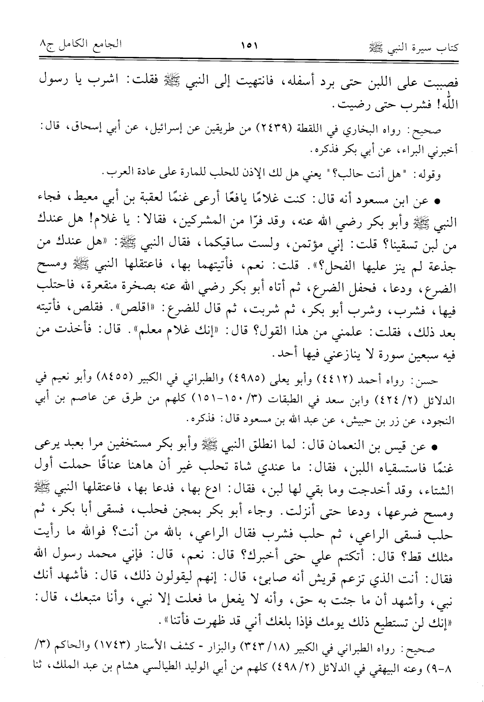 • عن قيس بن النعمان قال: لما انطلق النبي - صلى الله عليه وسلم - وأبو بكر مستخفين مرا بعبد يرعى غنمًا فاستسقياه اللبن، فقال: ما عندي شاة تحلب غير أن هاهنا عناقًا حملت أول الشتاء، وقد أخدجت وما بقي لها لبن، فقال: ادع بها، فدعا بها، فاعتقلها النبي - صلى الله عليه وسلم - ومسح ضرعها، ودعا حتى أنزلت. وجاء أبو بكر بمجن فحلب، فسقى أبا بكر، ثم حلب فسقى الراعي، ثم حلب فشرب فقال الراعي، بالله من أنت؟ فوالله ما رأيت مثلك قط؟ قال: أتكتم علي حتى أخبرك؟ قال: نعم، قال: فإني محمد رسول الله فقال: أنت الذي تزعم قريش أنه صابئ، قال: إنهم ليقولون ذلك، قال: فأشهد أنك نبي، وأشهد أن ما جئت به حق، وأنه لا يفعل ما فعلت إلا نبي، وأنا متبعك، قال: "إنك لن تستطيع ذلك يومك فإذا بلغك أني قد ظهرت فأتنا".