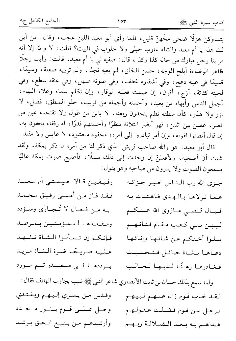 يتساوكن هزلًا ضحى مخّهنّ قليل، فلما رأى أبو معبد اللبن عجب، وقال: من أين لك هذا يا أم معبد والشاء عازب حبلى ولا حلوب في البيت؟ قالت: لا والله إلا أنه مر بنا رجل مبارك من حاله كذا وكذا، قال: صفيه لي يا أم معبد، قالت: رأيت رجلًا ظاهر الوضاءة أبلج الوجه، حسن الخلق، لم يعبه ثجلة، ولم تزريه صعلة، وسيمًا، قسيمًا في عينه دعج، وفي أشفاره غطف، وفي صوته صهل، وفي عنقه سطع، وفي لحيته كثاثة، أزج، أقرن، إن صمت فعليه الوقار، وإن تكلم سماه وعلاه البهاء، أجمل الناس وأبهاه من بعيد، وأحسنه وأجمله من قريب، حلو المنطق، فضل، لا نزر ولا هذر، كأن منطقه نظم يتحدرن ربعته، لا باين من طول ولا تقتحمه عين من قصر، غصن بين اثنين، فهو أنضر الثلاثة منظرًا وأحسنهم قدرًا، له رفقاء يحفون به، إن قال أنصتوا لقوله، وإن أمر تبادروا إلى أمره، محفود محشود، لا عابس ولا مفند.