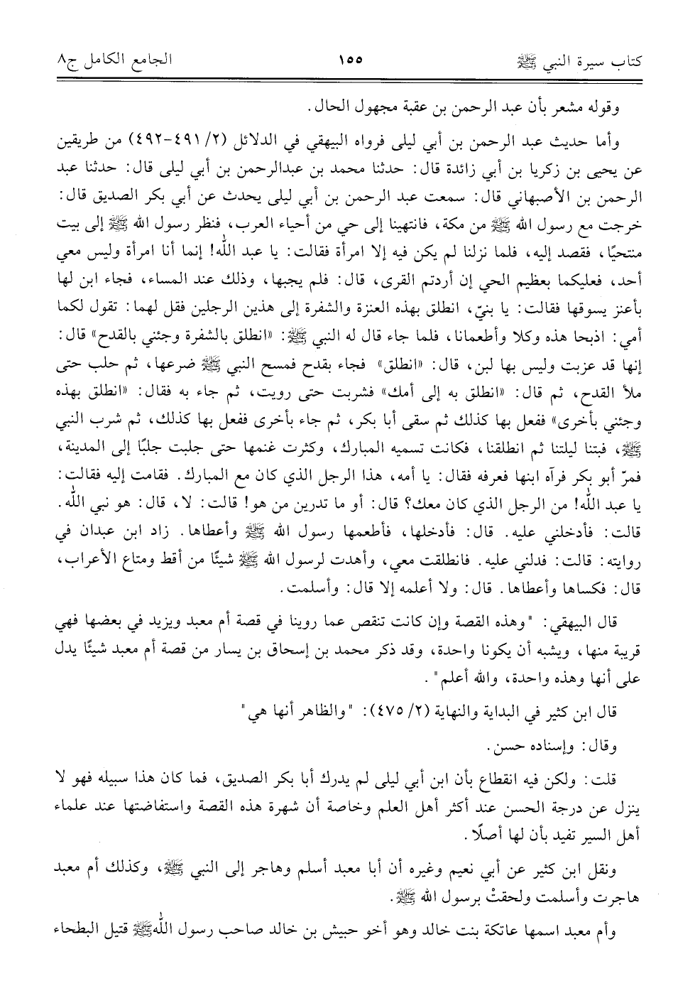 وأما حديث عبد الرحمن بن أبي ليلى فرواه البيهقي في الدلائل (٢/ ٤٩١ - ٤٩٢) من طريقين عن يحيى بن زكريا بن أبي زائدة قال: حدثنا محمد بن عبد الرحمن بن أبي ليلى قال: حدثنا عبد الرحمن بن الأصبهاني قال: سمعت عبد الرحمن بن أبي ليلى يحدت عن أبي بكر الصديق قال: خرجت مع رسول الله - صلى الله عليه وسلم - من مكة، فانتهينا إلى حي من أحياء العرب، فنظر رسول الله - صلى الله عليه وسلم - إلى بيت منتحيًا، فقصد إليه، فلما نزلنا لم يكن فيه إلا امرأة فقالت: يا عبد الله! إنما أنا امرأة وليس معي أحد، فعليكما بعظيم الحي إن أردتم القرى، قال: فلم يجبها، وذلك عند المساء، فجاء ابن لها بأعنز يسوقها فقالت: يا بنيّ، انطلق بهذه العنزة والشفرة إلى هذين الرجلين فقل لهما: تقول لكما أمي: اذبحا هذه وكلا وأطعمانا، فلما جاء قال له النبي - صلى الله عليه وسلم -: "انطلق بالشفرة وجئني بالقدح" قال: إنها قد عزبت وليس بها لبن، قال: "انطلق" فجاء بقدح فمسح النبي - صلى الله عليه وسلم - ضرعها، ثم حلب حتى ملأ القدح، ثم قال: "انطلق به إلى أمك" فشربت حتى رويت، ثم جاء به فقال: "انطلق بهذه وجئني بأخرى" ففعل بها كذلك ثم سقى أبا بكر، تم جاء بأخرى ففعل بها كذلك، ثم شرب النبي - صلى الله عليه وسلم -، فبتنا ليلتنا ثم انطلقنا، فكانت تسميه المبارك، وكثرت غنمها حتى جلبت جلبًا إلى المدينة، فمرّ أبو بكر فرآه ابنها فعرفه فقال: يا أمه، هذا الرجل الذي كان مع المبارك. فقامت إليه فقالت: يا عبد الله! من الرجل الذي كان معك؟ قال: أو ما تدرين من هو! قالت: لا، قال: هو نبي الله. قالت: فأدخلني عليه. قال: فأدخلها، فأطعمها رسول الله - صلى الله عليه وسلم - وأعطاها. زاد ابن عبدان في روايته: قالت: فدلني عليه. فانطلقت معي، وأهدت لرسول الله - صلى الله عليه وسلم - شيئًا من أقط ومتاع الأعراب، قال: فكساها وأعطاها. قال: ولا أعلمه إلا قال: وأسلمت.