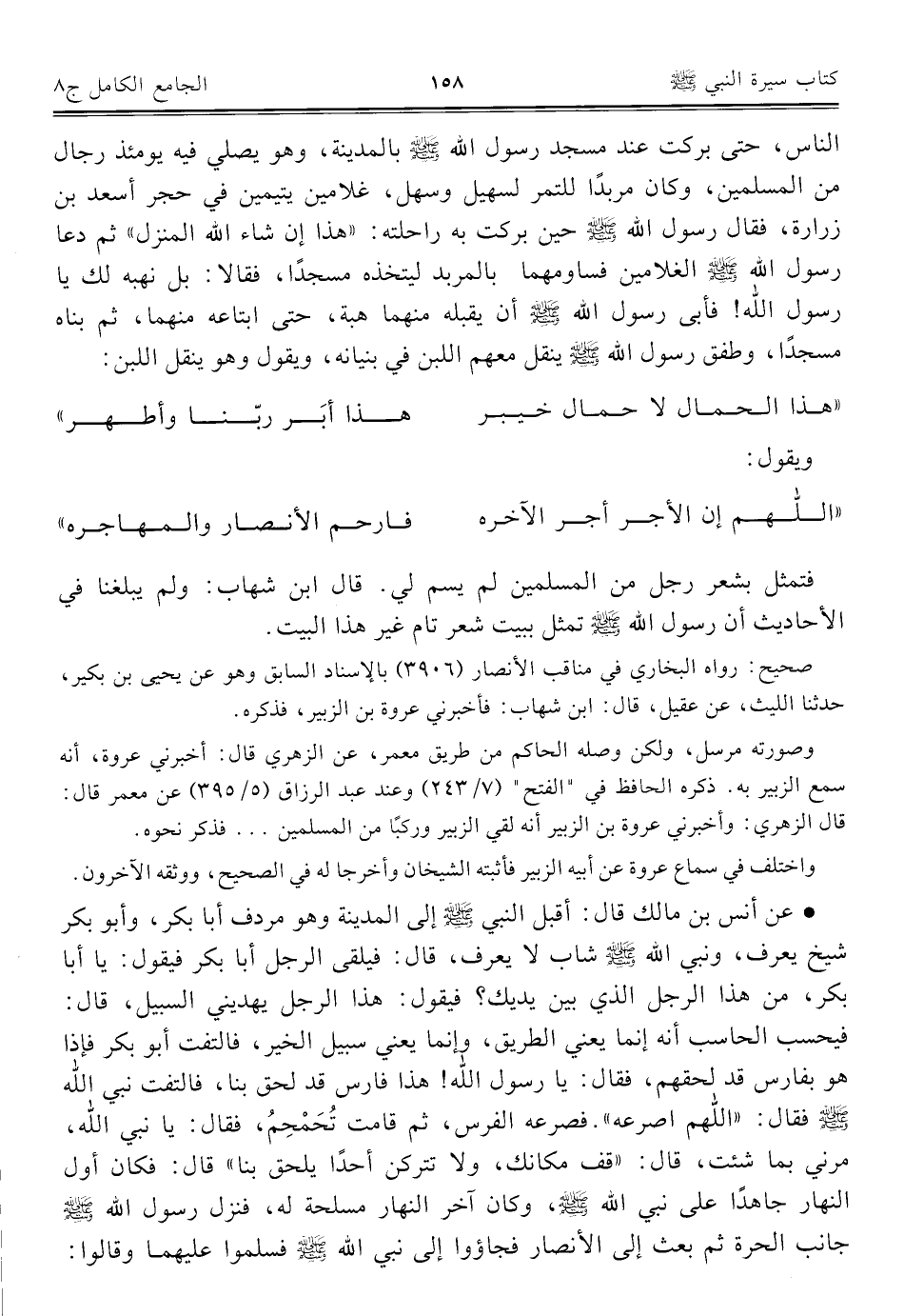 الناس، حتى بركت عند مسجد رسول الله - صلى الله عليه وسلم - بالمدينة، وهو يصلي فيه يومئذ رجال من المسلمين، وكان مربدًا للتمر لسهيل وسهل، غلامين يتيمين في حجر أسعد بن زرارة، فقال رسول الله - صلى الله عليه وسلم - حين بركت به راحلته: "هذا إن شاء الله المنزل" ثم دعا رسول الله - صلى الله عليه وسلم - الغلامين فساومهما بالمربد ليتخذه مسجدًا، فقالا: بل نهبه لك يا رسول الله! فأبى رسول الله - صلى الله عليه وسلم - أن يقبله منهما هبة، حتى ابتاعه منهما، ثم بناه مسجدًا، وطفق رسول الله - صلى الله عليه وسلم - ينقل معهم اللبن في بنيانه، ويقول وهو ينقل اللبن: