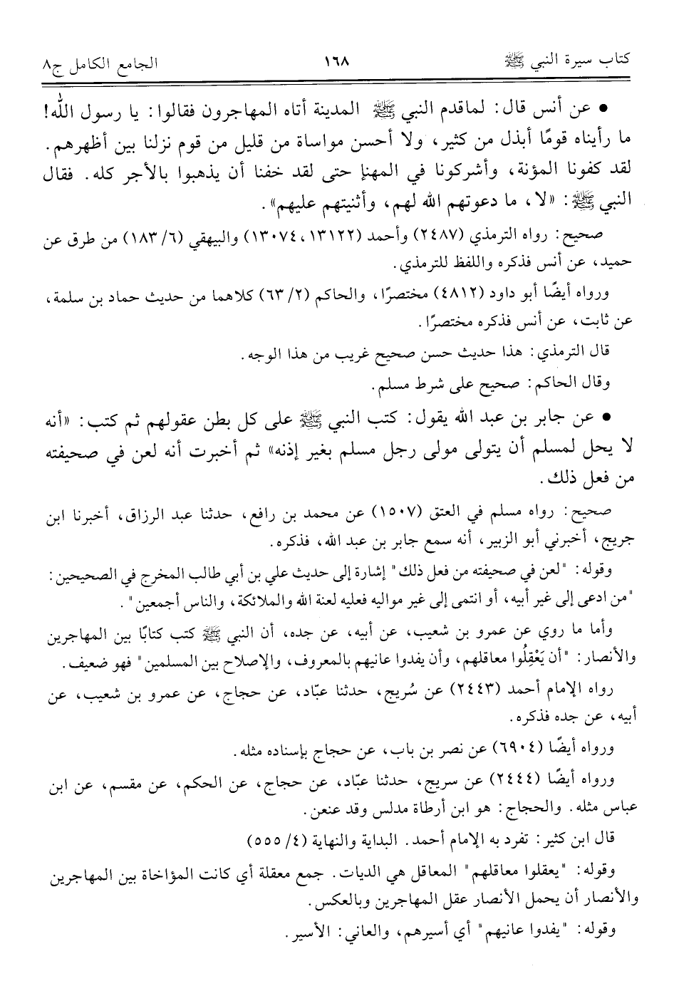 • عن جابر بن عبد الله يقول: كتب النبي - صلى الله عليه وسلم - على كل بطن عقولهم ثم كتب: "أنه لا يحل لمسلم أن يتولى مولى رجل مسلم بغير إذنه" ثم أخبرت أنه لعن في صحيفته من فعل ذلك.