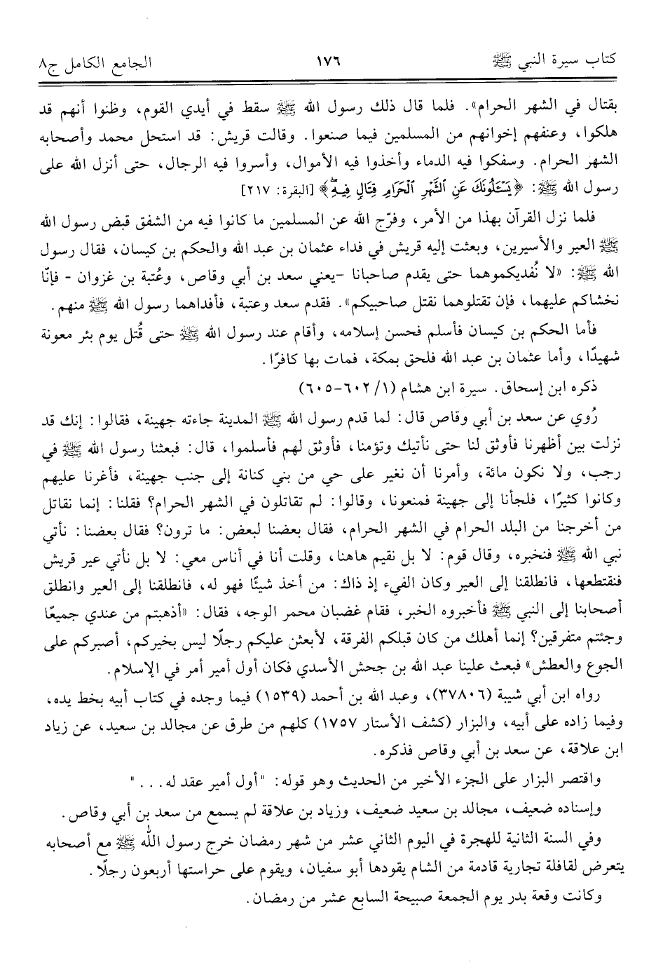 بقتال في الشهر الحرام". فلمّا قال ذلك رسول الله - صلى الله عليه وسلم - سقط في أيدي القوم، وظنوا أنهم قد هلكوا، وعنفهم إخوانهم من المسلمين فيما صنعوا. وقالت قريش: قد استحل محمد وأصحابه الشهر الحرام. وسفكوا فيه الدماء وأخذوا فيه الأموال، وأسروا فيه الرجال، حتَّى أنزل الله على رسول الله - صلى الله عليه وسلم -: {يَسْأَلُونَكَ عَنِ الشَّهْرِ الْحَرَامِ قِتَالٍ فِيهِ قُلْ قِتَالٌ فِيهِ} [البقرة: ٢١٧].