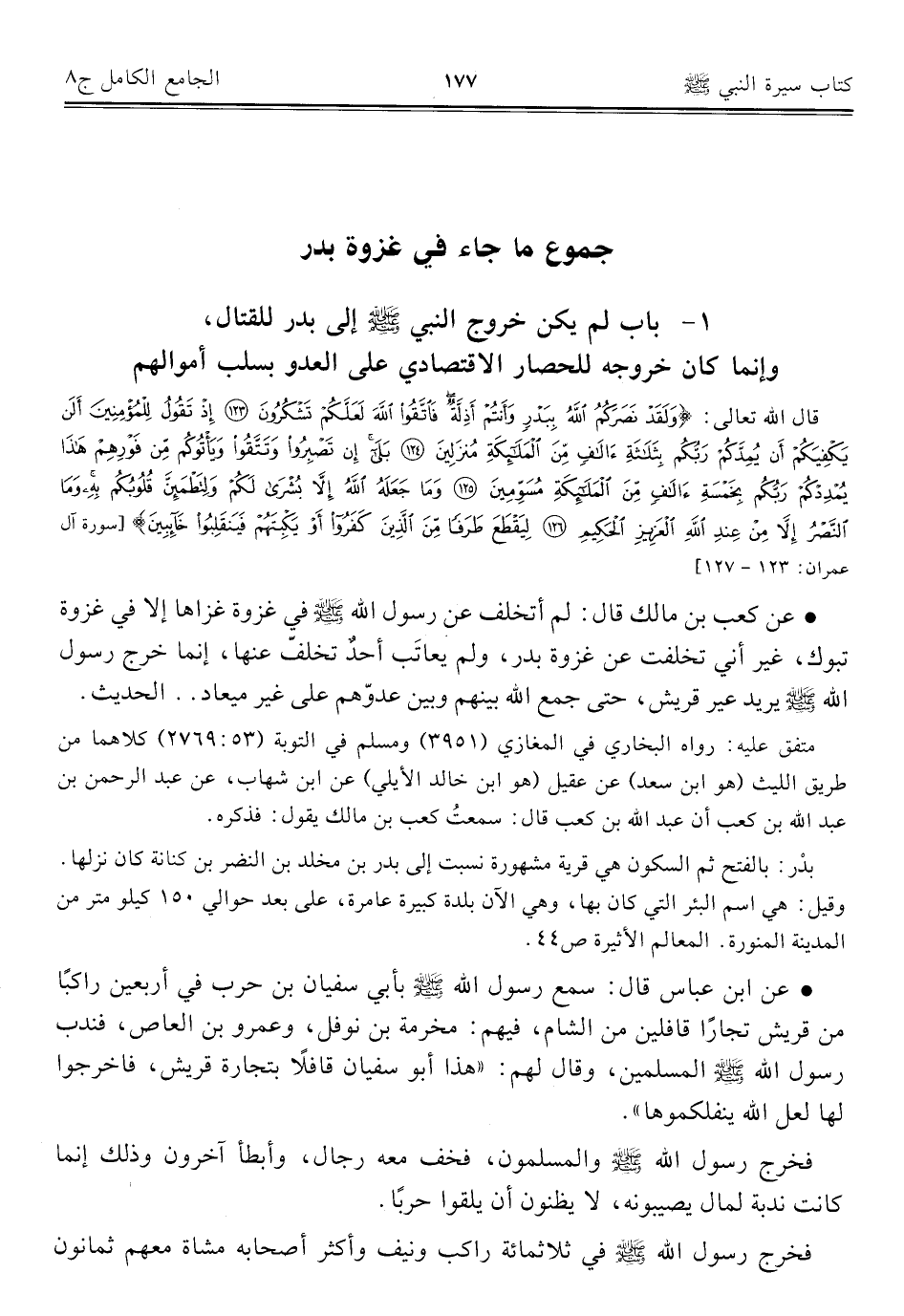 ١ - باب لم يكن خروج النَّبِيّ - صلى الله عليه وسلم - إلى بدر للقتال، وإنما كان خروجه للحصار الاقتصادي على العدو بسلب أموالهم