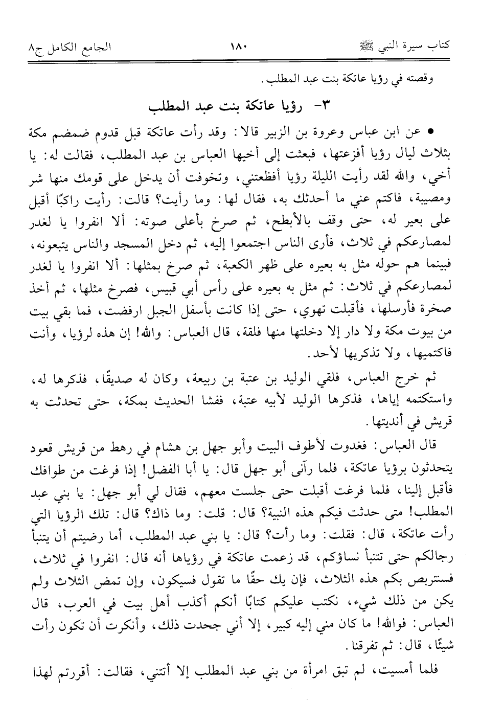 قال العباس: فغدوت لأطوف البيت وأبو جهل بن هشام في رهط من قريش قعود يتحدثون برؤيا عاتكة، فلمّا رآني أبو جهل قال: يا أبا الفضل! إذا فرغت من طوافك فأقبل إلينا، فلمّا فرغت أقبلت حتَّى جلست معهم، فقال لي أبو جهل: يا بني عبد المطلب! متى حدثت فيكم هذه النبية؟ قال: قلت: وما ذاك؟ قال: تلك الرؤيا التي رأت عاتكة، قال: فقلت: وما رأت؟ قال: يا بني عبد المطلب، أما رضيتم أن يتنبأ رجالكم حتَّى تتنبأ نساؤكم، قد زعمت عاتكة في رؤياها أنه قال: انفروا في ثلاث، فسنتربص بكم هذه الثلاث، فإن يك حقًّا ما تقول فسيكون، وإن تمض الثلاث ولم يكن من ذلك شيء، نكتب عليكم كتابًا أنكم أكذب أهل بيت في العرب، قال العباس: فوالله! ما كان مني إليه كبير، إِلَّا أني جحدت ذلك، وأنكرت أن تكون رأت شيئًا، قال: ثمّ تفرقنا.