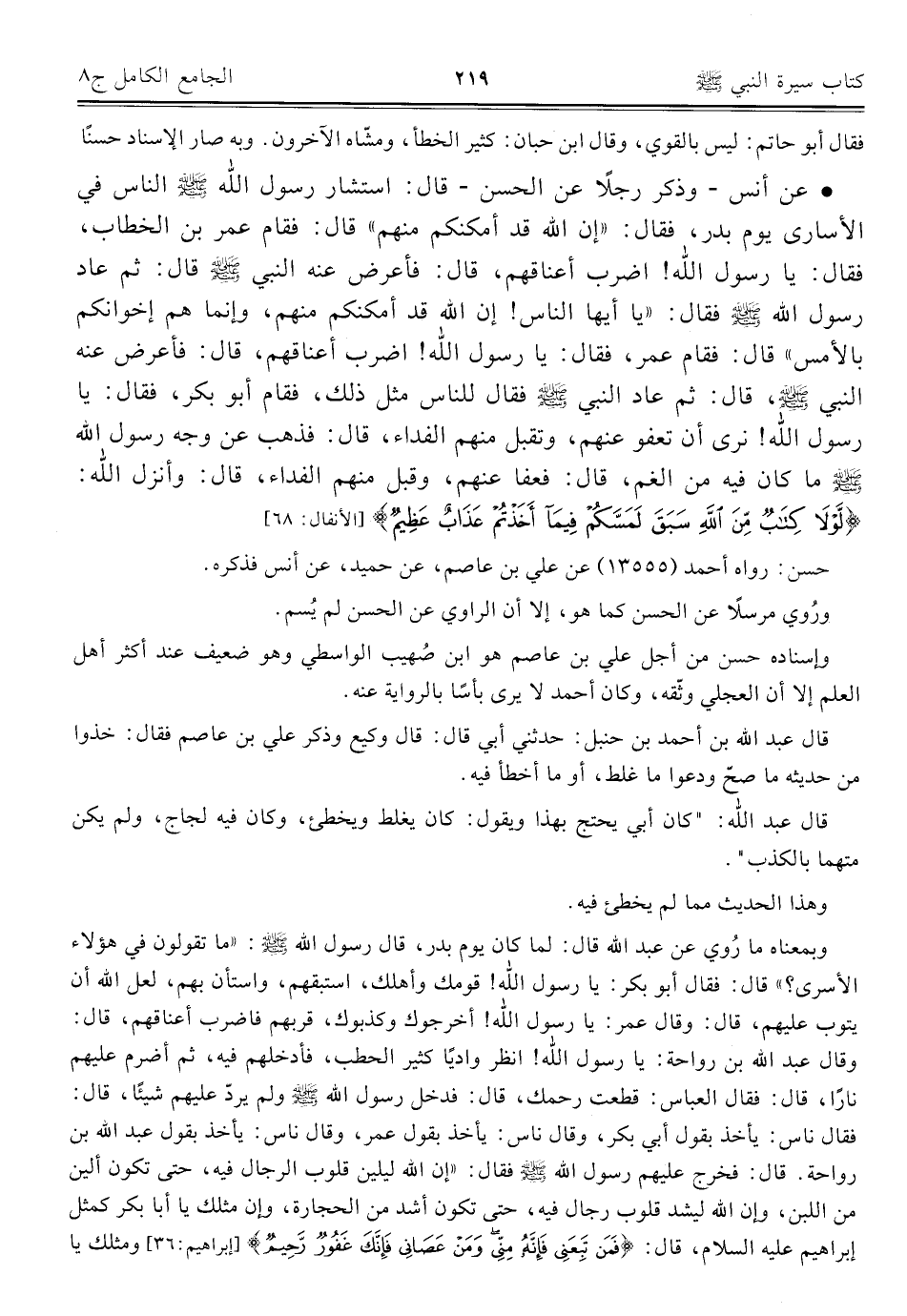 • عن أنس - وذكر رجلًا عن الحسن - قال: استشار رسول الله - صلى الله عليه وسلم - الناس في الأسارى يوم بدر، فقال: "إنَّ الله قد أمكنكم منهم" قال: فقام عمر بن الخطّاب، فقال: يا رسول الله! اضرب أعناقهم، قال: فأعرض عنه النَّبِي - صلى الله عليه وسلم - قال: ثمّ عاد رسول الله - صلى الله عليه وسلم - فقال: "يا أيها الناس! إن الله قد أمكنكم منهم، وإنما هم إخوانكم بالأمس" قال: فقام عمر، فقال: يا رسول الله! اضرب أعناقهم، قال: فأعرض عنه النَّبِي - صلى الله عليه وسلم -، قال: ثمّ عاد النَّبِي - صلى الله عليه وسلم - فقال للناس مثل ذلك، فقام أبو بكر، فقال: يا رسول الله! نرى أن تعفو عنهم، وتقبل منهم الفداء، قال: فذهب عن وجه رسول الله - صلى الله عليه وسلم - ما كان فيه من الغم، قال: فعفا عنهم، وقبل منهم الفداء، قال: وأنزل الله: {لَوْلَا كِتَابٌ مِنَ اللَّهِ سَبَقَ لَمَسَّكُمْ فِيمَا أَخَذْتُمْ عَذَابٌ عَظِيمٌ} [الأنفال: ٦٨].