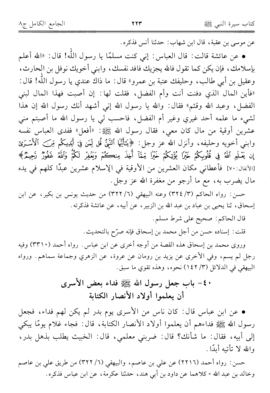 • عن عائشة قالت: قال العباس: إني كنت مسلمًا يا رسول الله! قال: "الله أعلم بإسلامك، فإن يكن كما تقول فالله يجزيك فافد نفسك، وابني أخويك نوفل بن الحارث، وعقيل بن أبي طالب، وحليفك عتبة بن عمرو"قال: ما ذاك عندي يا رسول الله! قال: "فأين المال الذي دفنت أنت وأم الفضل، فقلت لها: إن أصبت فهذا المال لبني الفضل، وعبد الله وقثم" فقال: والله يا رسول الله إني أشهد أنك رسول الله إن هذا لشيء ما علمه أحد غيري وغير أم الفضل، فاحسب لي يا رسول الله ما أصبتم مني عشرين أوقية من مال كان معي، فقال رسول الله - صلى الله عليه وسلم -: "أفعل" ففدى العباس نفسه وابني أخويه وحليفه، وأنزل الله عز وجل: {يَاأَيُّهَا النَّبِيُّ قُلْ لِمَنْ فِي أَيْدِيكُمْ مِنَ الْأَسْرَى إِنْ يَعْلَمِ اللَّهُ فِي قُلُوبِكُمْ خَيْرًا يُؤْتِكُمْ خَيْرًا مِمَّا أُخِذَ مِنْكُمْ وَيَغْفِرْ لَكُمْ وَاللَّهُ غَفُورٌ رَحِيمٌ} [الأنفال: ٧٠] فأعطاني مكان العشرين من الأوقية في الإسلام عشرين عبدًا كلهم في يده مال يضرب به، مع ما أرجو من مغفرة الله عز وجل.