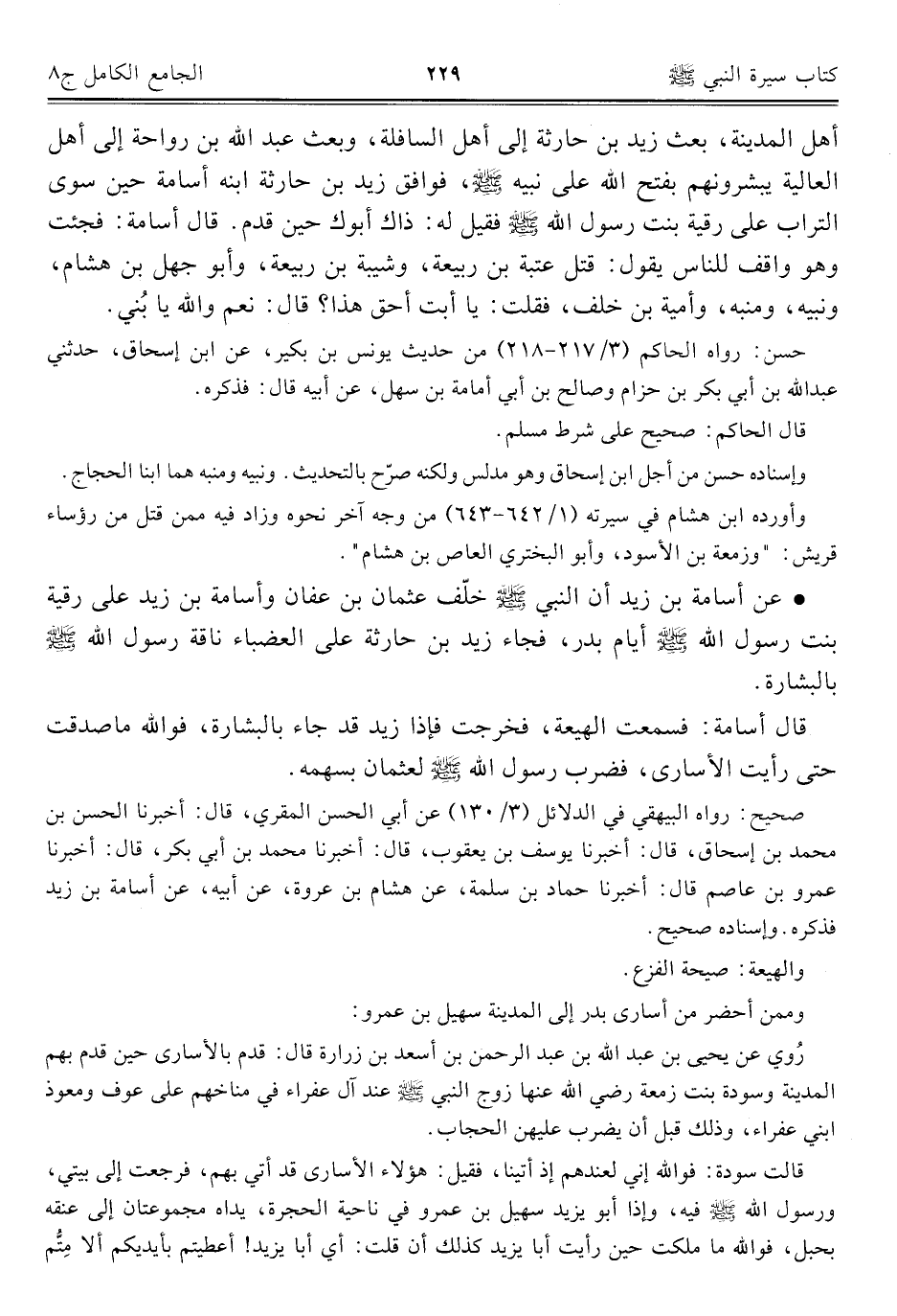 • عن أسامة بن زيد أن النبي - صلى الله عليه وسلم - خلّف عثمان بن عفان وأسامة بن زيد على رقية بنت رسول الله - صلى الله عليه وسلم - أيام بدر، فجاء زيد بن حارثة على العضباء ناقة رسول الله - صلى الله عليه وسلم - بالبشارة.