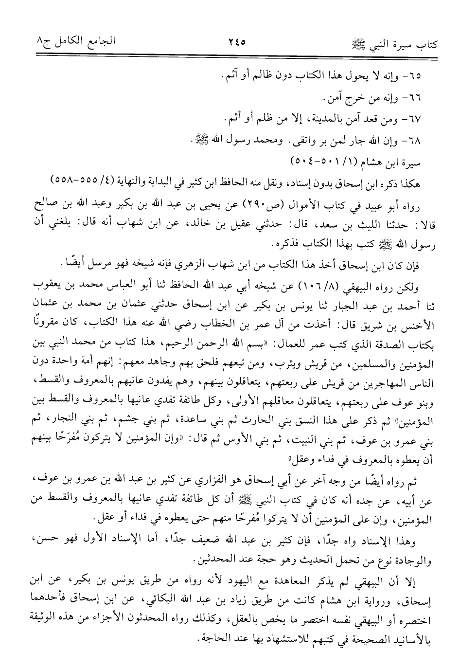 ولكن رواه البيهقي (٨/ ١٠٦) عن شيخه أبي عبد الله الحافظ ثنا أبو العباس محمد بن يعقوب ثنا أحمد بن عبد الجبار ثنا يونس بن بكير عن ابن إسحاق حدثني عثمان بن محمد بن عثمان الأخنس بن شريق قال: أخذت من آل عمر بن الخطاب رضي الله عنه هذا الكتاب، كان مقرونًا بكتاب الصدقة الذي كتب عمر للعمال: "بِسْمِ اللَّهِ الرَّحْمَنِ الرَّحِيمِ، هذا كتاب من محمد النبي بين المؤمنين والمسلمين، من قريش ويثرب، ومن تبعهم فلحق بهم وجاهد معهم: إنهم أمة واحدة دون الناس المهاجرين من قريش على ربعتهم، يتعاقلون بينهم، وهم يفدون عانيهم بالمعروف والقسط، وبنو عوف على ربعتهم، يتعاقلون معاقلهم الأولى، وكل طائفة تفدي عانيها بالمعروف والقسط بين المؤمنين" ثم ذكر على هذا النسق بني الحارث ثم بني ساعدة، ثم بني جشم، ثم بني النجار، ثم بني عمرو بن عوف، ثم بني النبيت، ثم بني الأوس ثم قال: "وإن المؤمنين لا يتركون مُفرَحًا بينهم أن يعطوه بالمعروف في فداء وعقل".