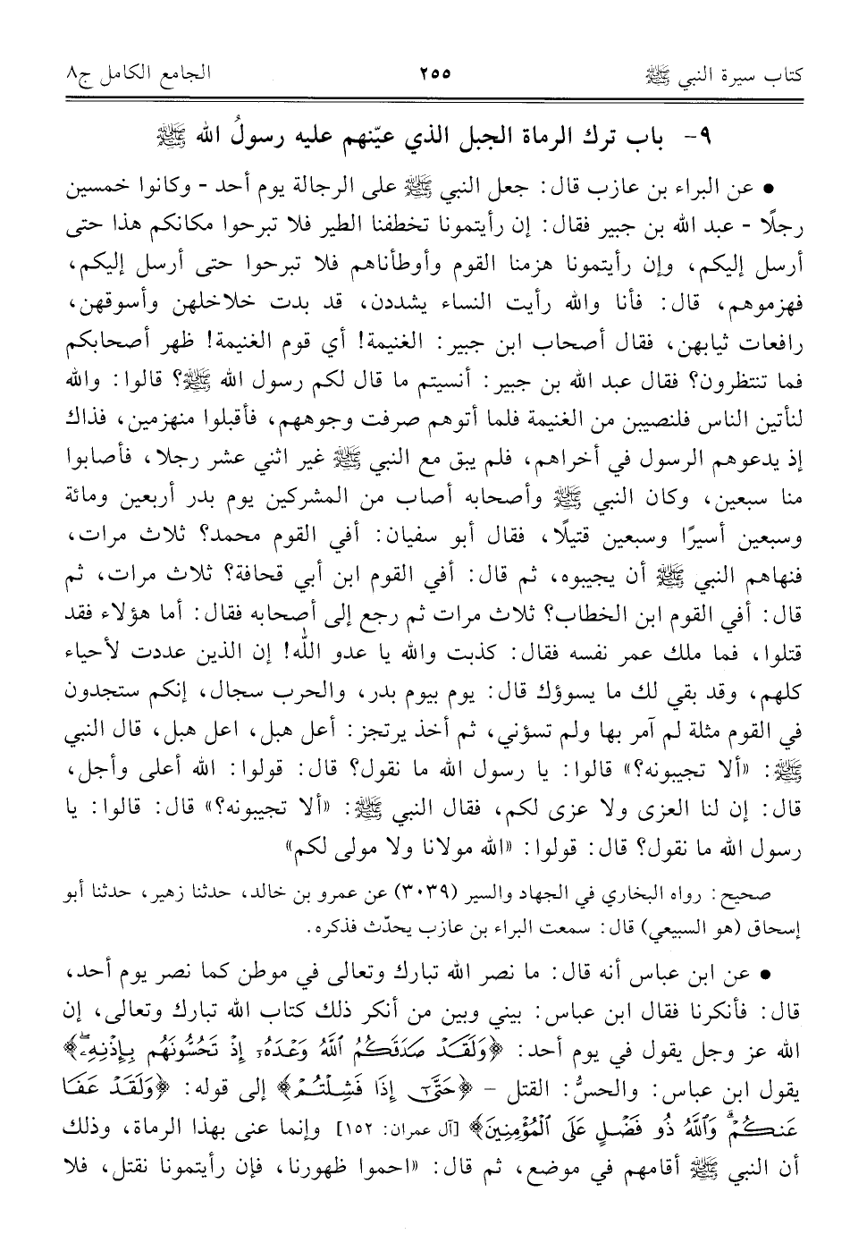• عن البراء بن عازب قال: جعل النبي - صلى الله عليه وسلم - على الرجالة يوم أحد - وكانوا خمسين رجلًا - عبد الله بن جبير فقال: إن رأيتمونا تخطفنا الطير فلا تبرحوا مكانكم هذا حتى أرسل إليكم، وإن رأيتمونا هزمنا القوم وأوطأناهم فلا تبرحوا حتى أرسل إليكم، فهزموهم، قال: فأنا والله رأيت النساء يشددن، قد بدت خلاخلهن وأسوقهن، رافعات ثيابهن، فقال أصحاب ابن جبير: الغنيمة! أي قوم الغنيمة! ظهر أصحابكم فما تنتظرون؟ فقال عبد الله بن جبير: أنسيتم ما قال لكم رسول الله - صلى الله عليه وسلم -؟ قالوا: والله لنأتين الناس فلنصيبن من الغنيمة فلما أتوهم صرفت وجوههم، فأقبلوا منهزمين، فذاك إذ يدعوهم الرسول في أخراهم، فلم يبق مع النبي - صلى الله عليه وسلم - غير اثني عشر رجلا، فأصابوا منا سبعين، وكان النبي - صلى الله عليه وسلم - وأصحابه أصاب من المشركين يوم بدر أربعين ومائة وسبعين أسيرًا وسبعين قتيلًا، فقال أبو سفيان: أفي القوم محمد؟ ثلاث مرات، فنهاهم النبي - صلى الله عليه وسلم - أن يجيبوه، ثم قال: أفي القوم ابن أبي قحافة؟ ثلاث مرات، ثم قال: أفي القوم ابن الخطاب؟ ثلاث مرات ثم رجع إلى أصحابه فقال: أما هؤلاء فقد قتلوا، فما ملك عمر نفسه فقال: كذبت والله يا عدو الله! إن الذين عددت لأحياء كلهم، وقد بقي لك ما يسوؤك قال: يوم بيوم بدر، والحرب سجال، إنكم ستجدون في القوم مثلة لم آمر بها ولم تسؤني، ثم أخذ يرتجز: أعل هبل، اعل هبل، قال النبي - صلى الله عليه وسلم -: "ألا تجيبونه؟ " قالوا: يا رسول الله ما نقول؟ قال: قولوا: الله أعلى وأجل، قال: إن لنا العزى ولا عزى لكم، فقال النبي - صلى الله عليه وسلم -: "ألا تجيبونه؟ " قال: قالوا: يا رسول الله ما نقول؟ قال: قولوا: "الله مولانا ولا مولى لكم".