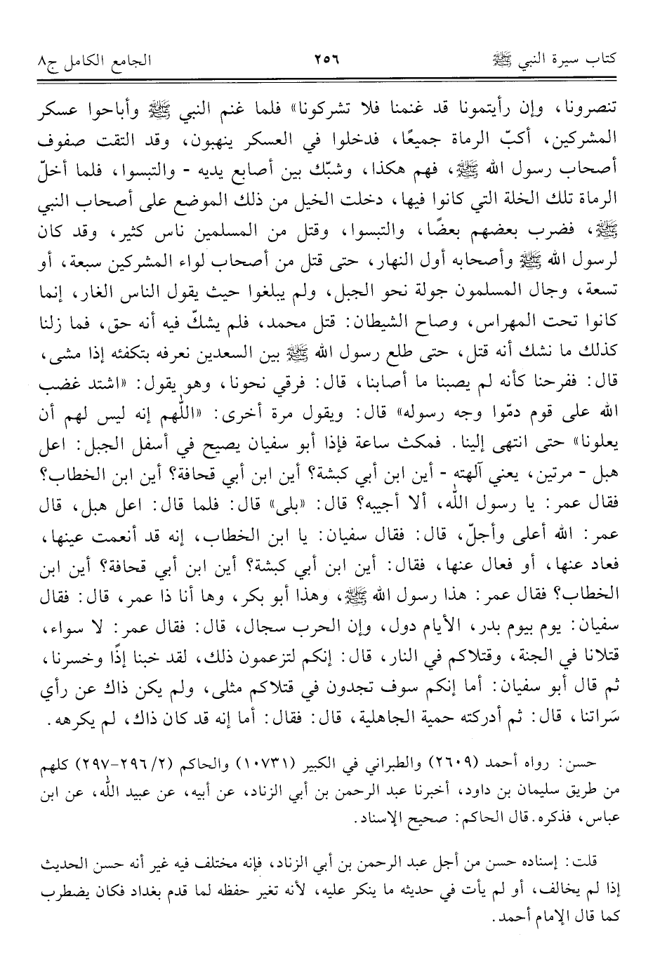 تنصرونا، وإن رأيتمونا قد غنمنا فلا تشركونا" فلما غنم النبي - صلى الله عليه وسلم - وأباحوا عسكر المشركين، أكبّ الرماة جميعًا، فدخلوا في العسكر ينهبون، وقد التقت صفوف أصحاب رسول الله - صلى الله عليه وسلم -، فهم هكذا، وشبّك بين أصابع يديه - والتبسوا، فلما أخلّ الرماة تلك الخلة التي كانوا فيها، دخلت الخيل من ذلك الموضع على أصحاب النبي - صلى الله عليه وسلم -، فضرب بعضهم بعضًا، والتبسوا، وقتل من المسلمين ناس كثير، وقد كان لرسول الله - صلى الله عليه وسلم - وأصحابه أول النهار، حتى قتل من أصحاب لواء المشركين سبعة، أو تسعة، وجال المسلمون جولة نحو الجبل، ولم يبلغوا حيث يقول الناس الغار، إنما كانوا تحت المهراس، وصاح الشيطان: قتل محمد، فلم يشكّ فيه أنه حق، فما زلنا كذلك ما نشك أنه قتل، حتى طلع رسول الله - صلى الله عليه وسلم - بين السعدين نعرفه بتكفئه إذا مشى، قال: ففرحنا كأنه لم يصبنا ما أصابنا، قال: فرقي نحونا، وهو يقول: "اشتد غضب الله على قوم دمّوا وجه رسوله" قال: ويقول مرة أخرى: "اللهم إنه ليس لهم أن يعلونا" حتى انتهى إلينا. فمكث ساعة فإذا أبو سفيان يصيح في أسفل الجبل: اعل هبل - مرتين، يعني آلهته - أين ابن أبي كبشة؟ أين ابن أبي قحافة؟ أين ابن الخطاب؟ فقال عمر: يا رسول الله، ألا أجيبه؟ قال: "بلى" قال: فلما قال: اعل هبل، قال عمر: الله أعلى وأجلّ، قال: فقال سفيان: يا ابن الخطاب، إنه قد أنعمت عينها، فعاد عنها، أو فعال عنها، فقال: أين ابن أبي كبشة؟ أين ابن أبي قحافة؟ أين ابن الخطاب؟ فقال عمر: هذا رسول الله - صلى الله عليه وسلم -، وهذا أبو بكر، وها أنا ذا عمر، قال: فقال سفيان: يوم بيوم بدر، الأيام دول، وإن الحرب سجال، قال: فقال عمر: لا سواء، قتلانا في الجنة، وقتلاكم في النار، قال: إنكم لتزعمون ذلك، لقد خبنا إذًا وخسرنا، ثم قال أبو سفيان: أما إنكم سوف تجدون في قتلاكم مثلى، ولم يكن ذاك عن رأي سَراتنا، قال: ثم أدركته حمية الجاهلية، قال: فقال: أما إنه قد كان ذاك، لم يكرهه.