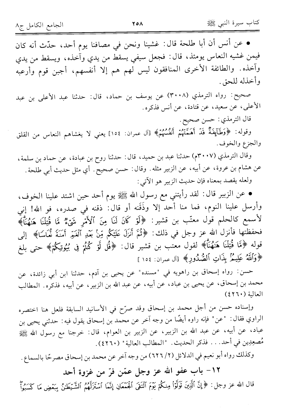 وقال الترمذي (٣٠٠٧ م) حدثنا عبد بن حميد، قال: حدثنا روح بن عبادة، عن حماد بن سلمة، عن هشام بن عروة، عن أبيه، عن الزبير مثله. وقال: حسن صحيح. أي مثل حديث أبي طلحة.