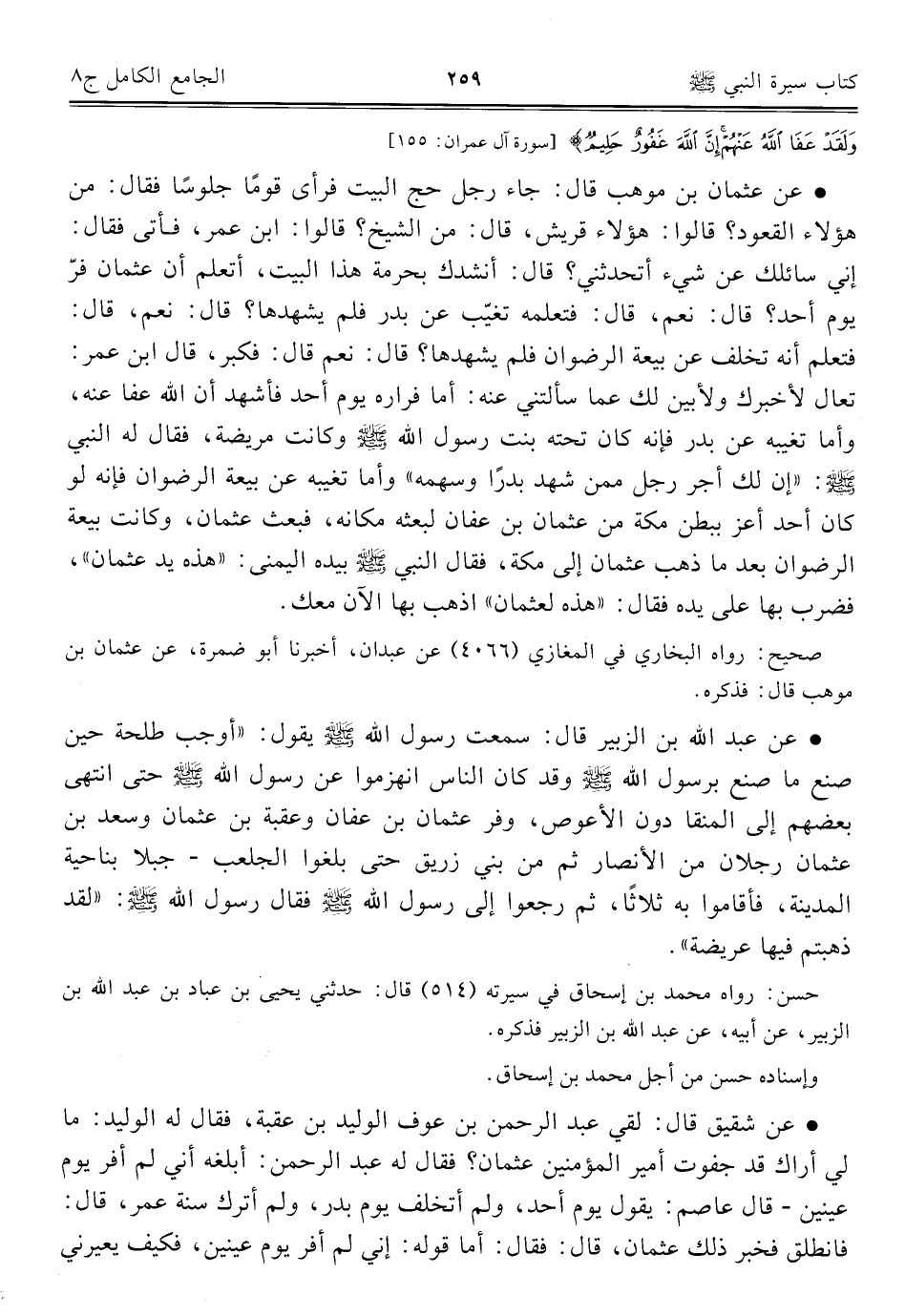 • عن عثمان بن موهب قال: جاء رجل حج البيت فرأى قومًا جلوسًا فقال: من هؤلاء القعود؟ قالوا: هؤلاء قريش، قال: من الشيخ؟ قالوا: ابن عمر، فأتى فقال: إني سائلك عن شيء أتحدثني؟ قال: أنشدك بحرمة هذا البيت، أتعلم أن عثمان فرّ يوم أحد؟ قال: نعم، قال: فتعلمه تغيّب عن بدر فلم يشهدها؟ قال: نعم، قال: فتعلم أنه تخلف عن بيعة الرضوان فلم يشهدها؟ قال: نعم قال: فكبر، قال ابن عمر: تعال لأخبرك ولأبين لك عما سألتني عنه: أما فراره يوم أحد فأشهد أن الله عفا عنه، وأما تغيبه عن بدر فإنه كان تحته بنت رسول الله - صلى الله عليه وسلم - وكانت مريضة، فقال له النبي - صلى الله عليه وسلم -: "إن لك أجر رجل ممن شهد بدرًا وسهمه" وأما تغيبه عن بيعة الرضوان فإنه لو كان أحد أعز ببطن مكة من عثمان بن عفان لبعثه مكانه، فبعث عثمان، وكانت بيعة الرضوان بعد ما ذهب عثمان إلى مكة، فقال النبي - صلى الله عليه وسلم - بيده اليمنى: "هذه يد عثمان"، فضرب بها على يده فقال: "هذه لعثمان" اذهب بها الآن معك.